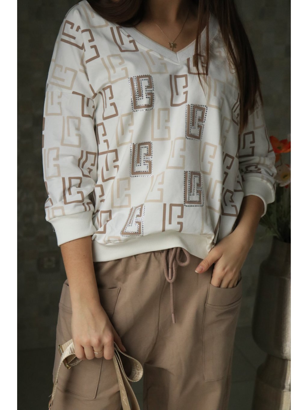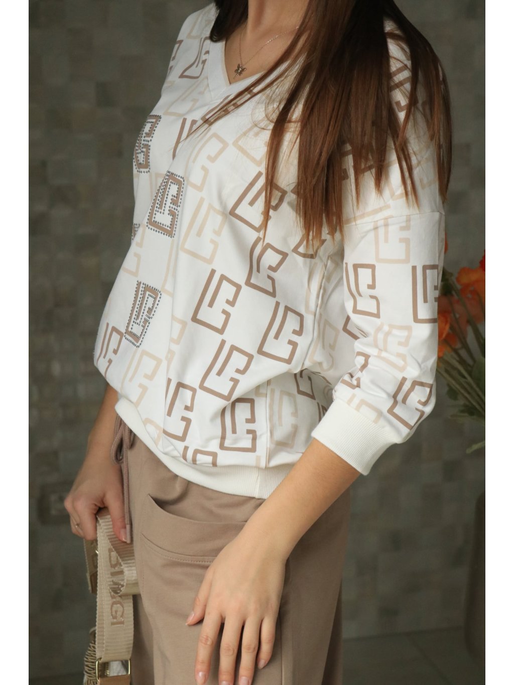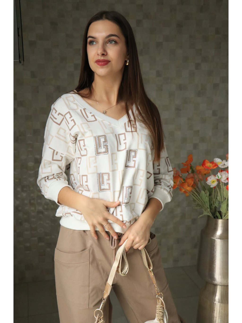 🤍✨ Mikinová bílá halenka s béžovými znaky a kamínky – pohodlí s elegantním detailem ✨🤍