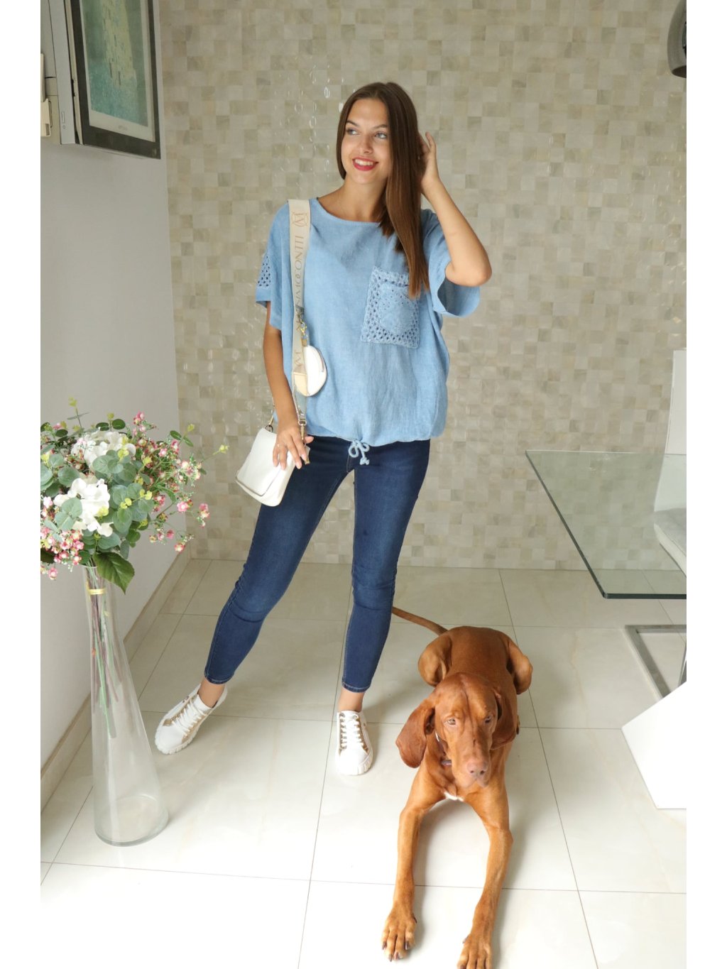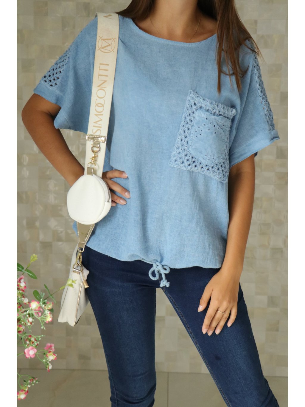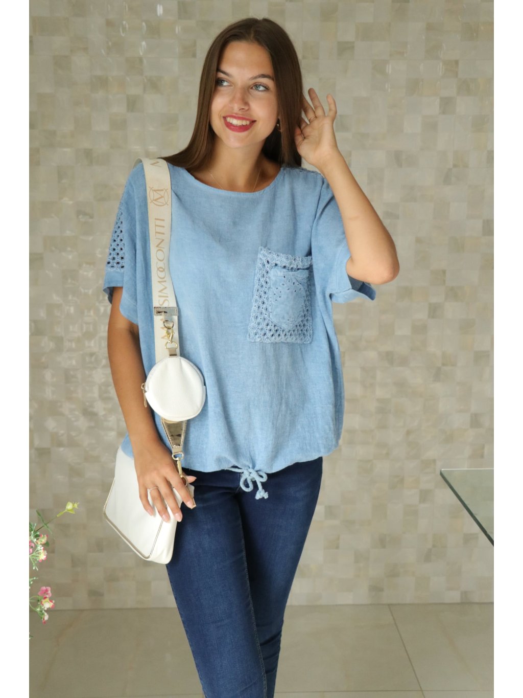 💃 Elegantní dámská halenka vyrobená z kvalitního materiálu (95% bavlna, 5% elastan) v přírodní barvě. Halenka má zajímavý design s dírovaným vzorem a kapsou ve přední části, který dodává nadčasový a ženský vzhled.