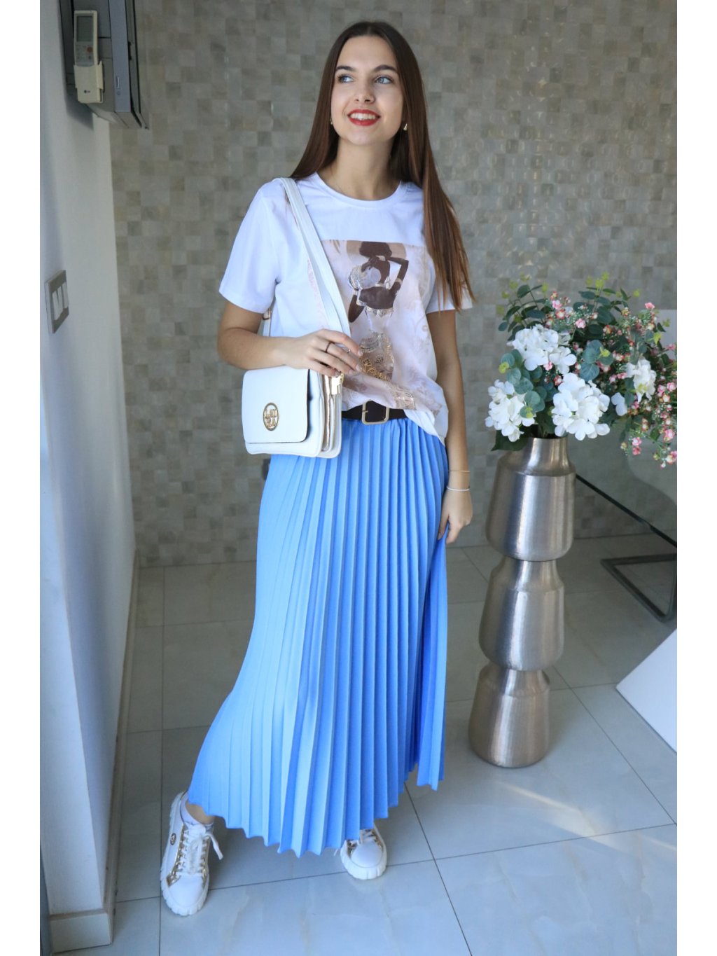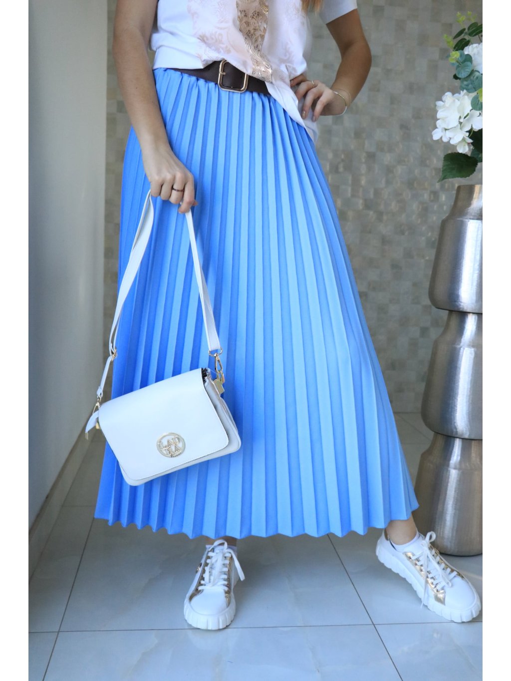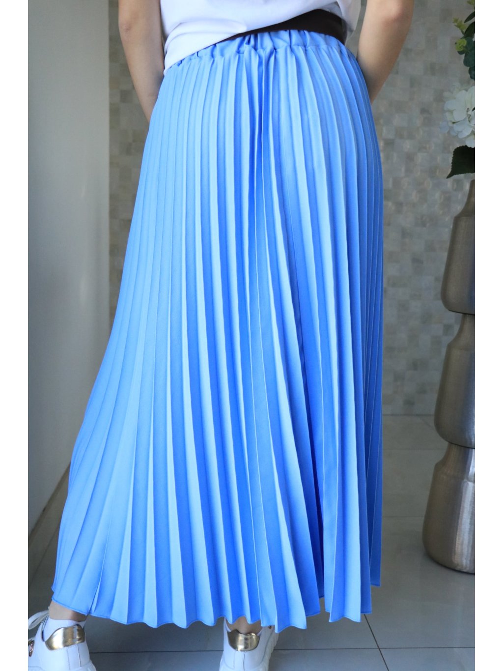 💙 Modrá plisovaná sukně s hnědým páskem – jarní kolekce 💙