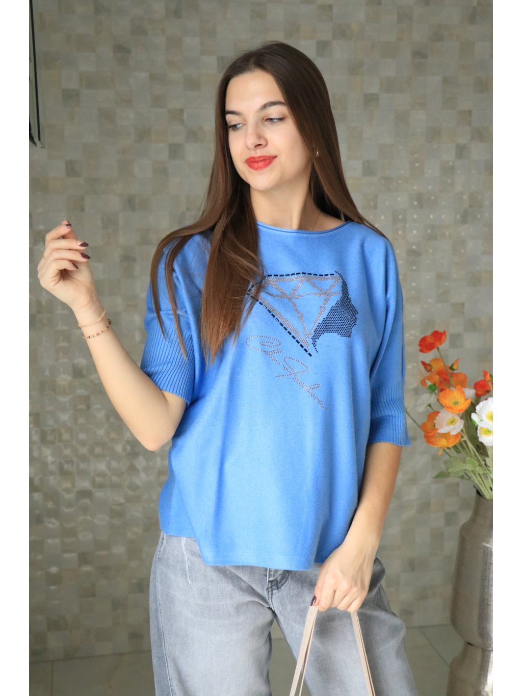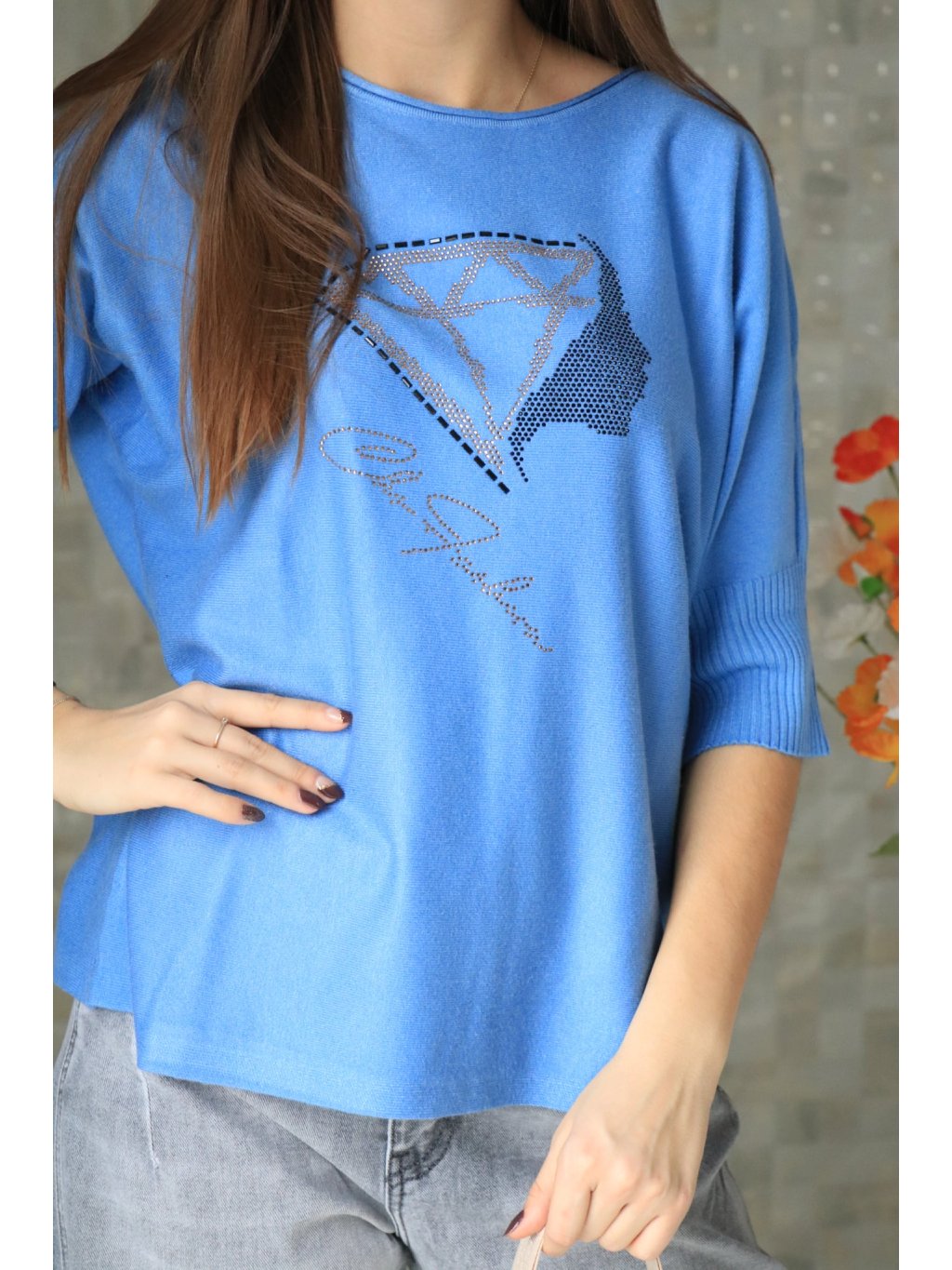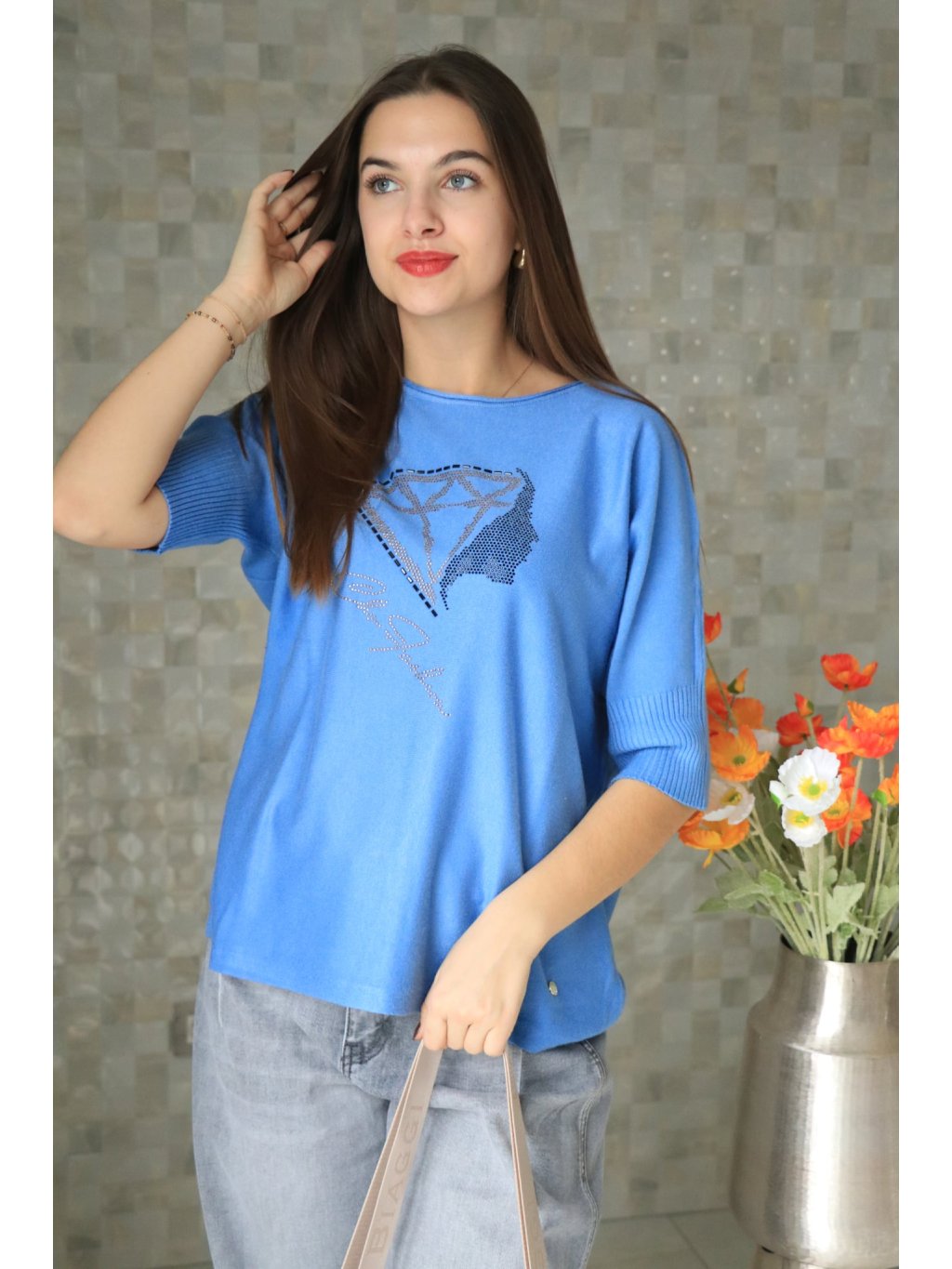 💙✨ Modrý svetřík s krátkým rukávem a kamínky Charyzma – jarní kolekce ✨💙