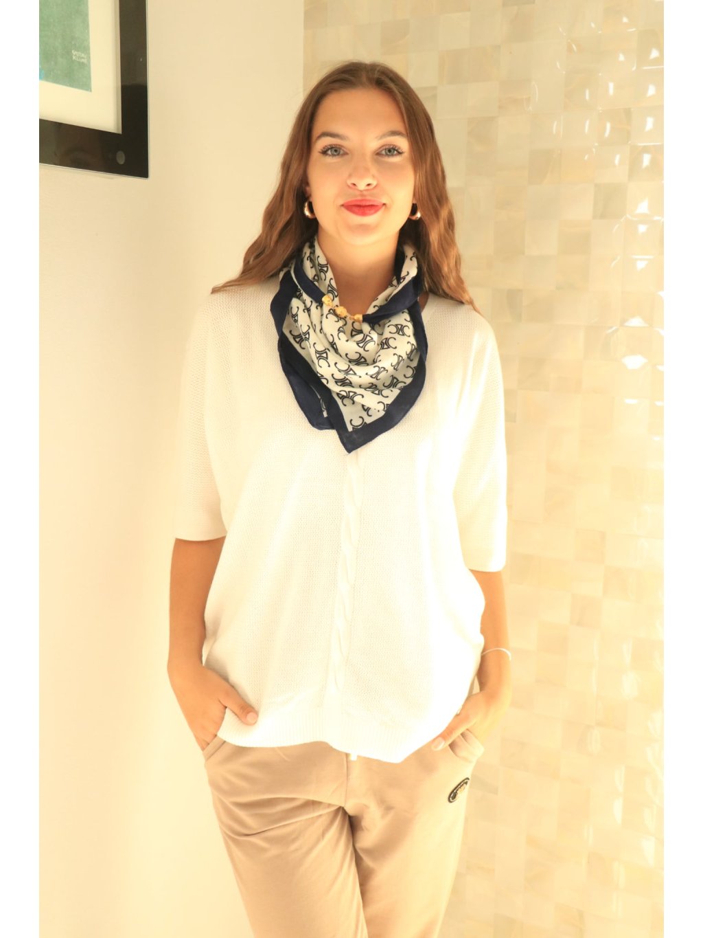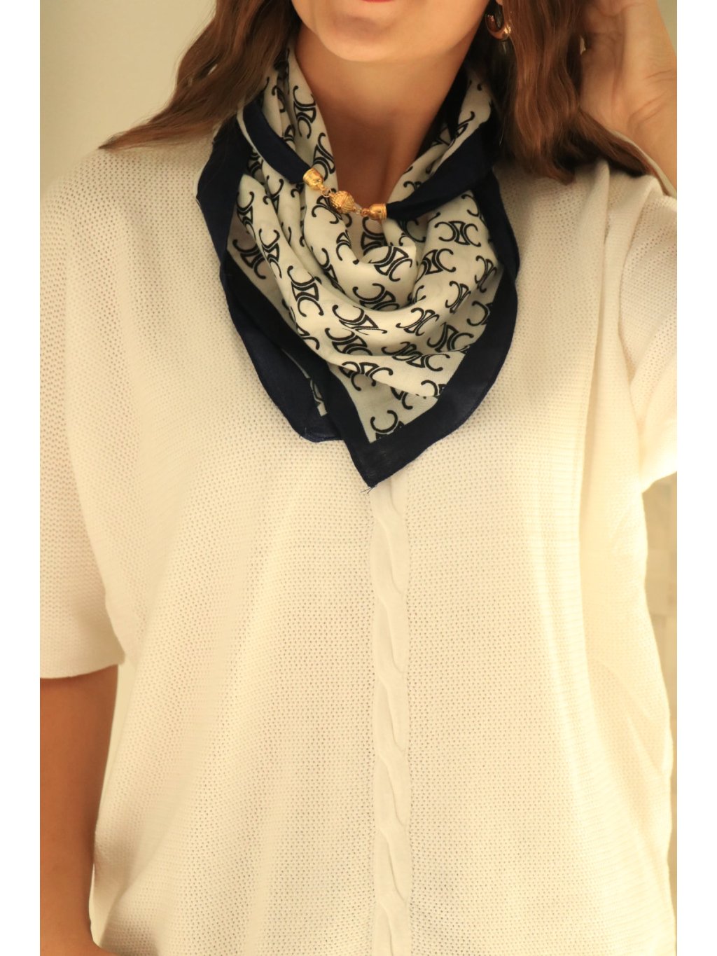 - 🧣 Jemný, měkce splývavý šátek v bílo-modrém provedení.