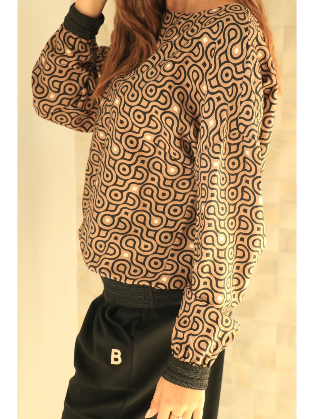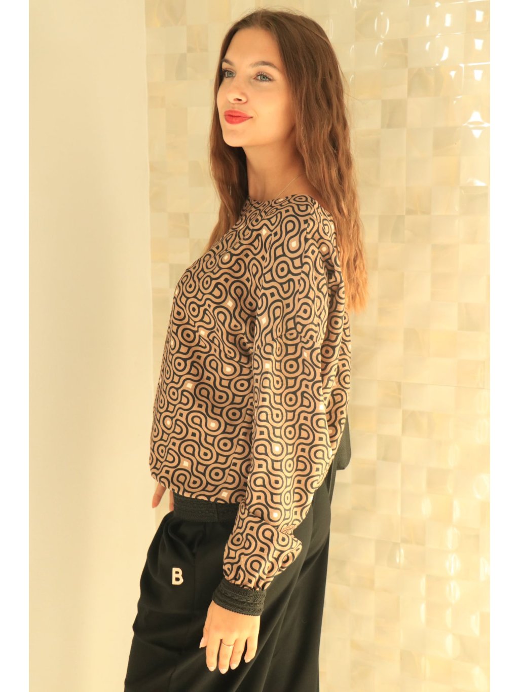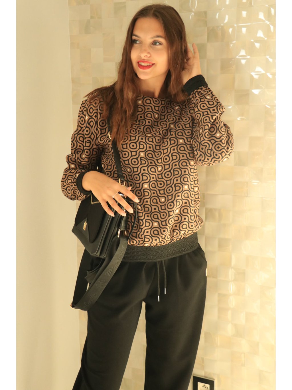 👚 **Podzimní halenka vzorovaná — camel s černým lemem**