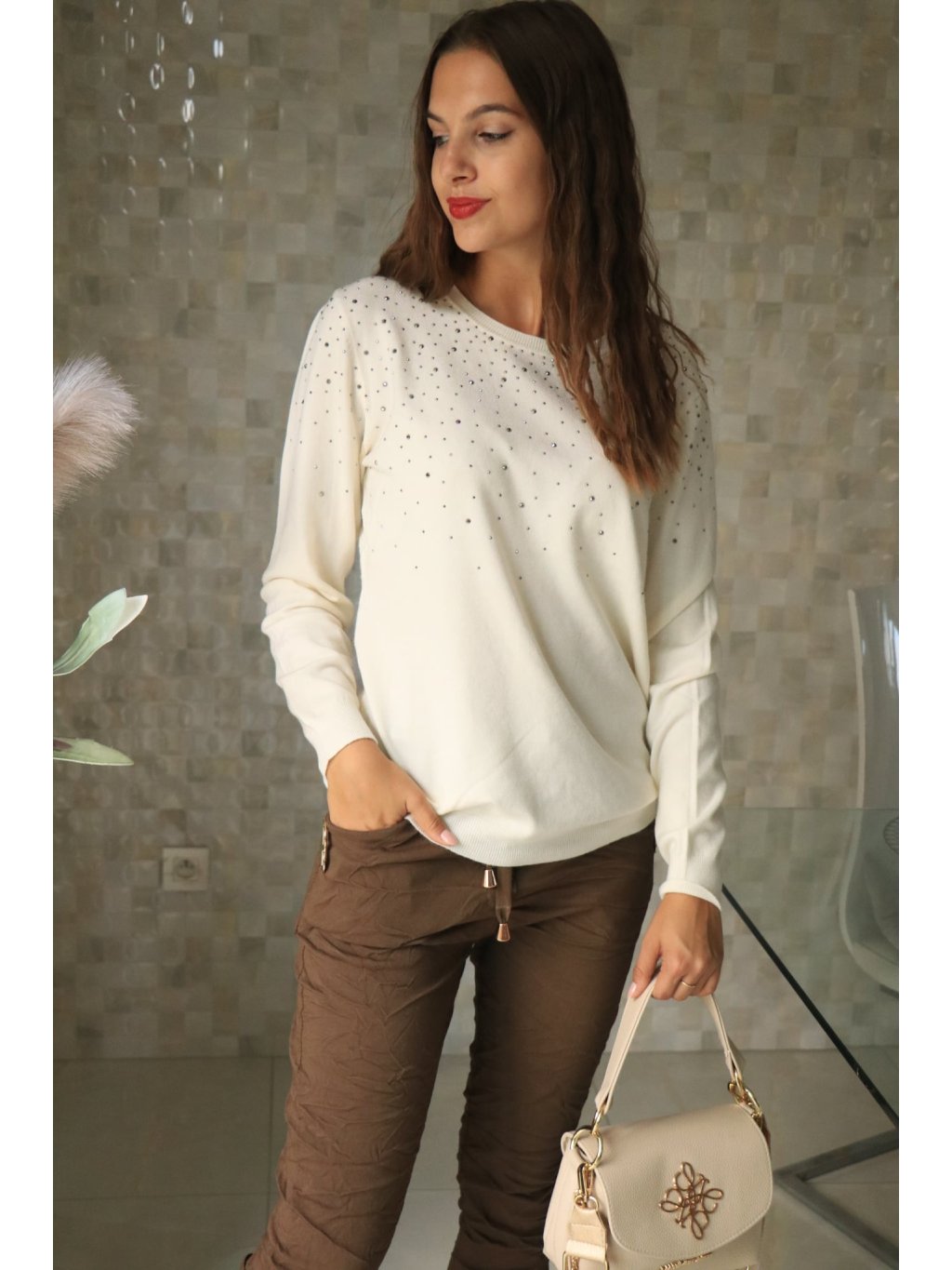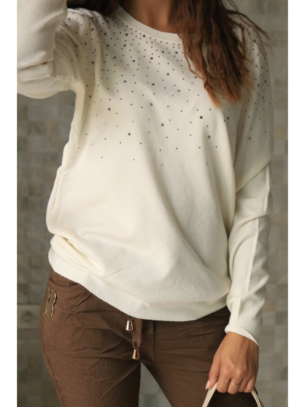 👗 **Podzimní svetřík s kamínky — krémový**