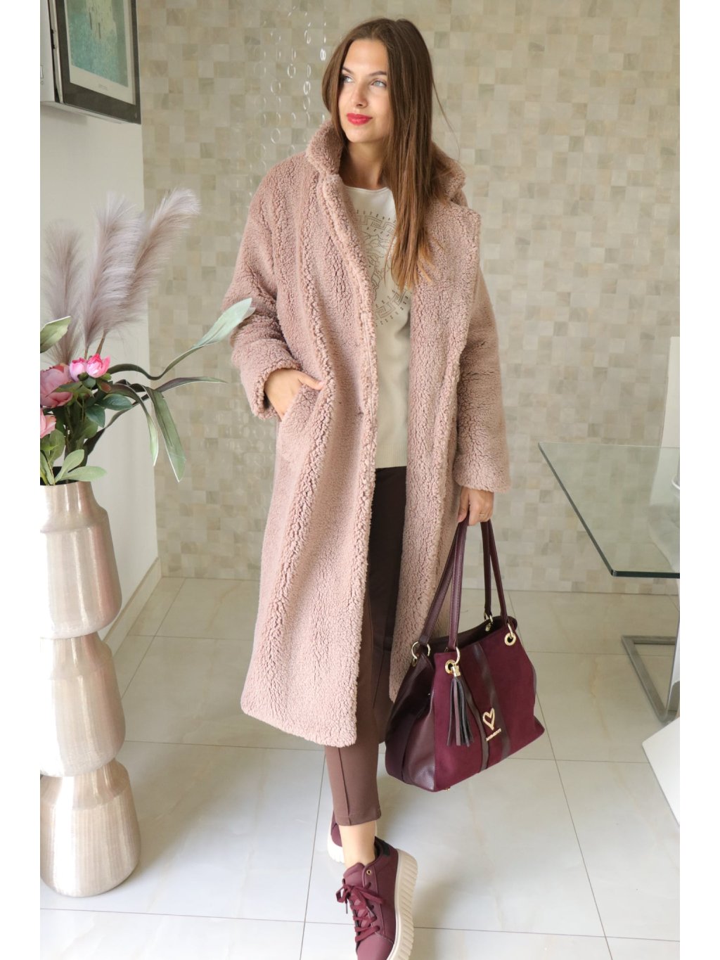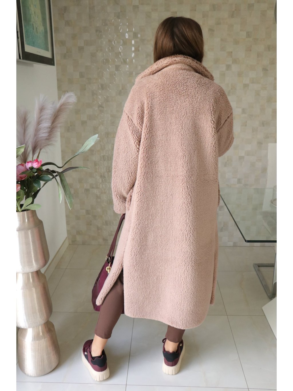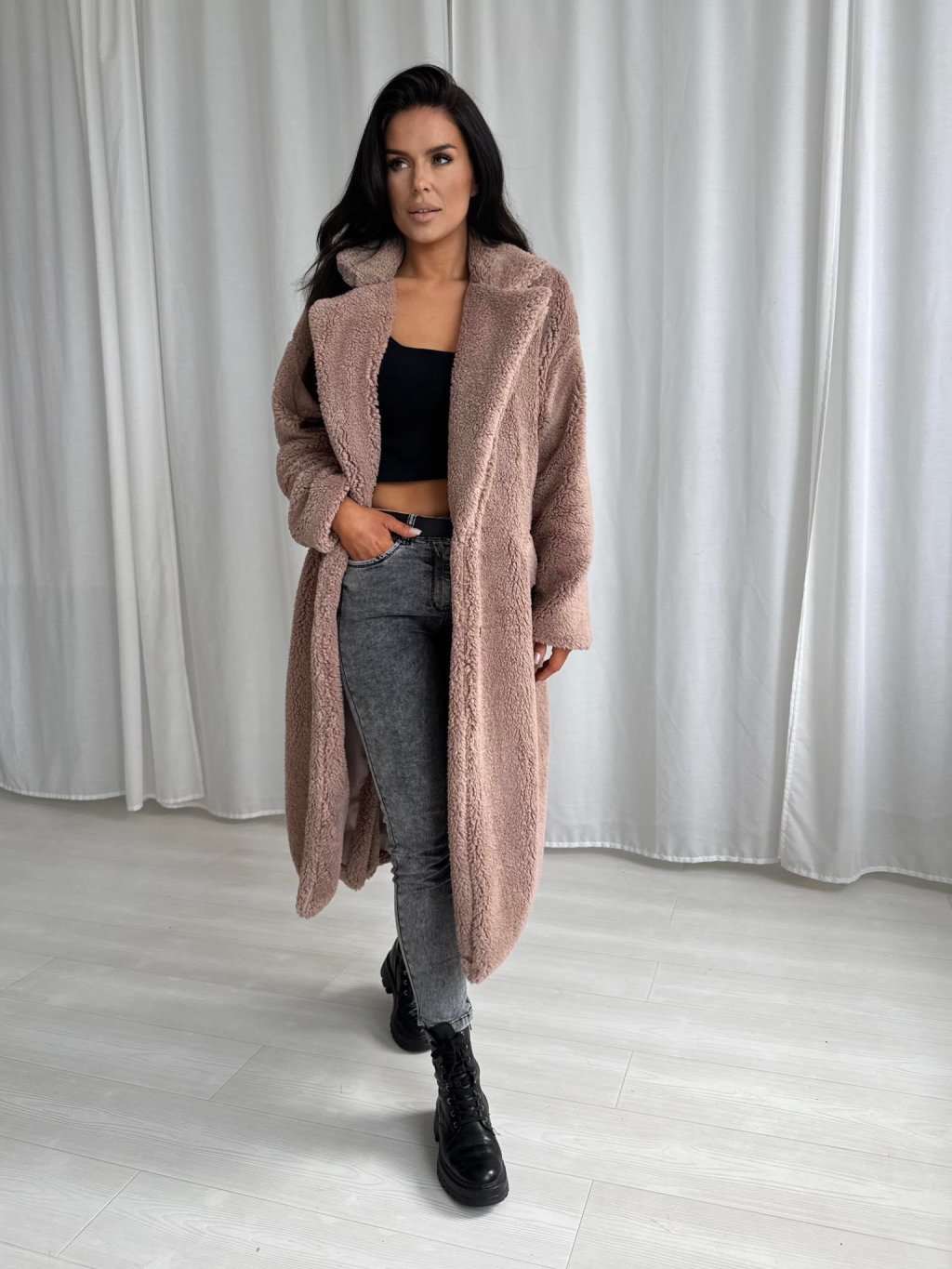 Měkký teddy kabátek v teplé světle béžové barvě, ideální pro chladné podzimní dny — pohodlný, stylový a snadno kombinovatelný.
