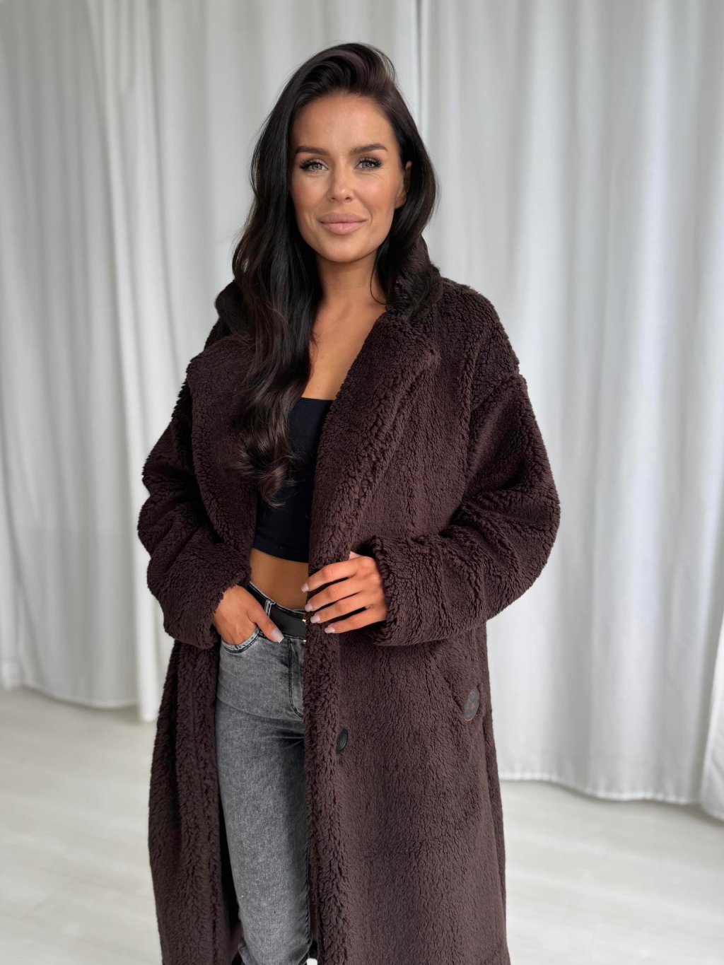 Měkký teddy kabátek v teplé tmavě hnědé barvě, ideální pro chladné podzimní dny — pohodlný, stylový a snadno kombinovatelný.