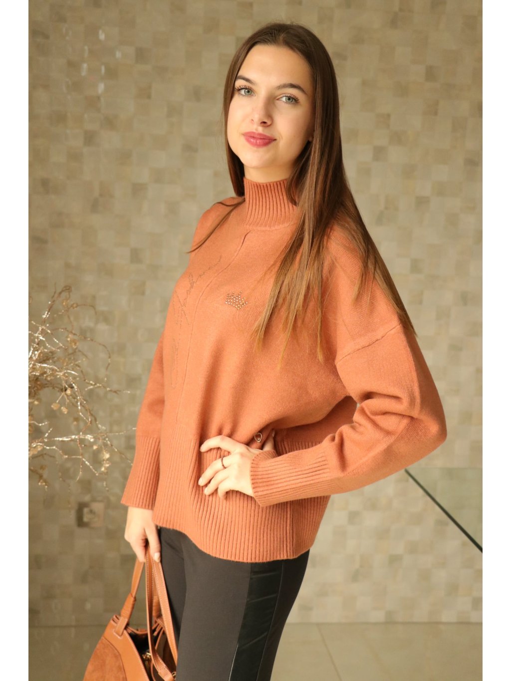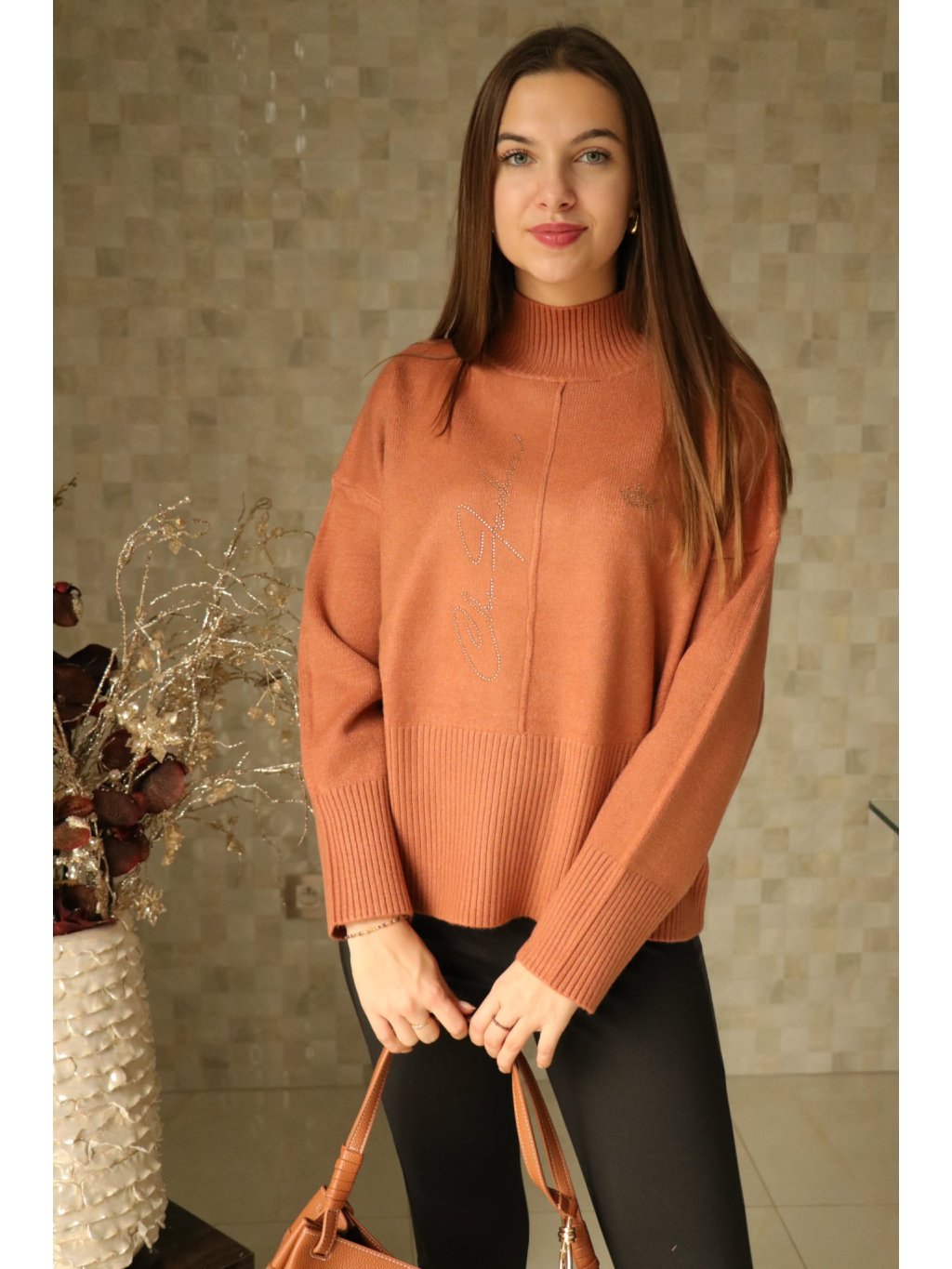 # Rezavý svetr s kamínkovým nápisem a korunkou