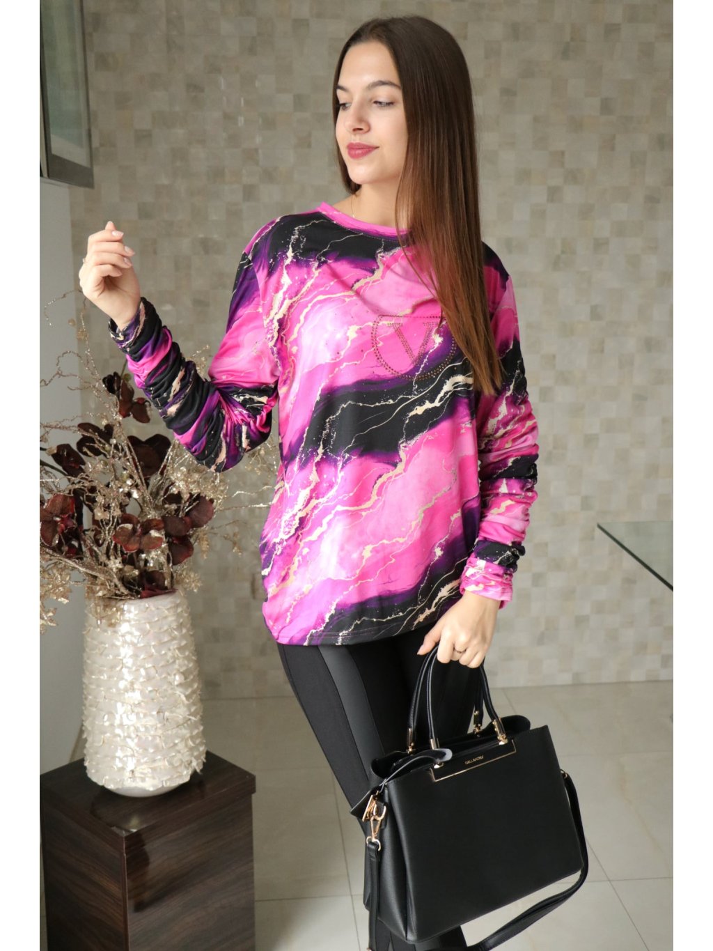 Objevte dokonalou kombinaci něžnosti a elegance s naší úchvatnou růžovou halenkou zdobenou třpytivými kamínky. Kulatý výstřih a efektní zřasené dlouhé rukávy vytváří romantický a sofistikovaný vzhled pro každou speciální příležitost.