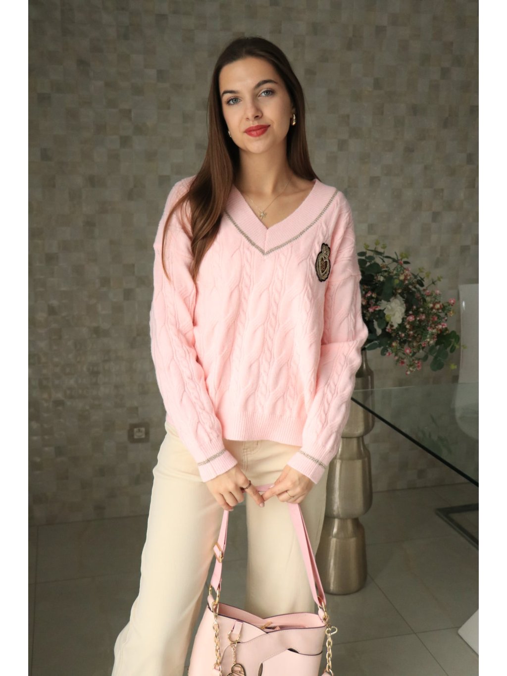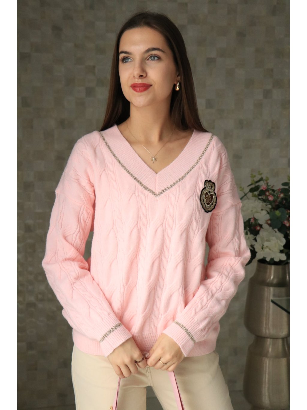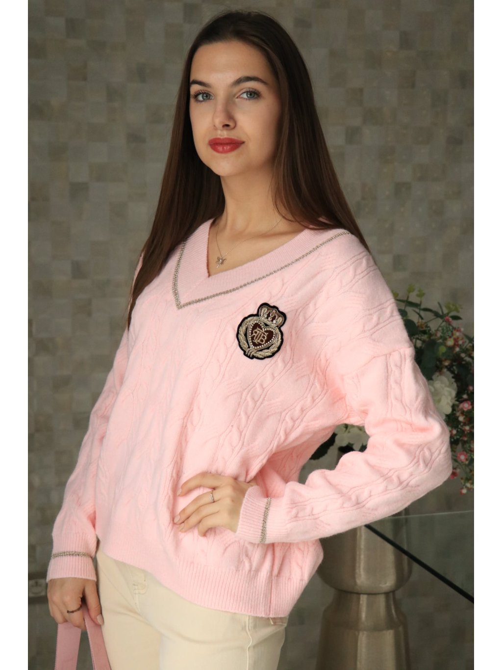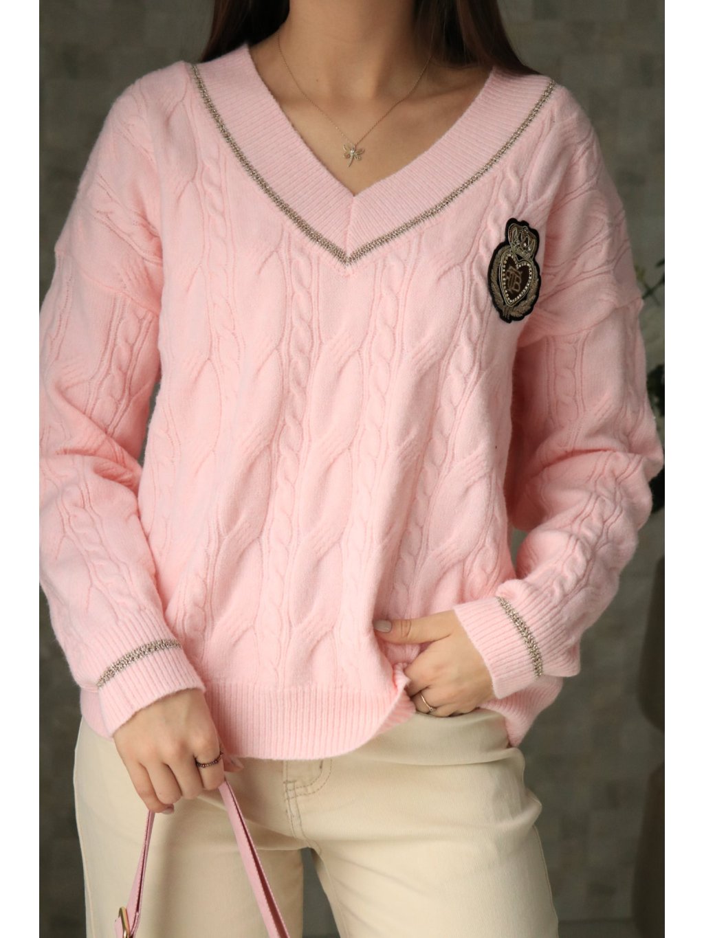 💗 Růžový svetr do V se znakem – jarní kolekce 💗