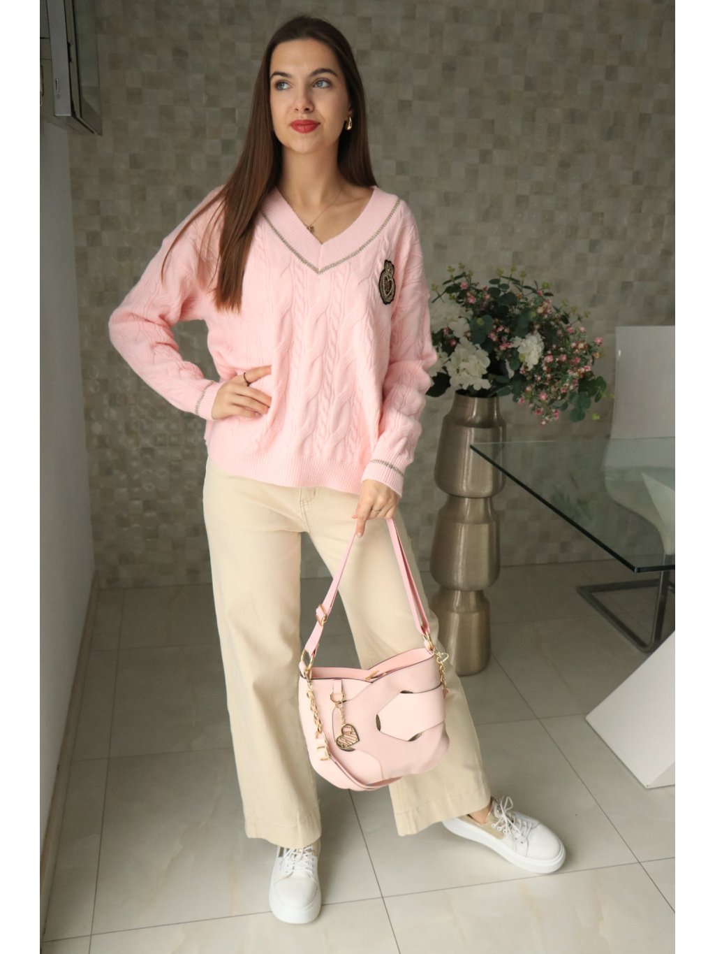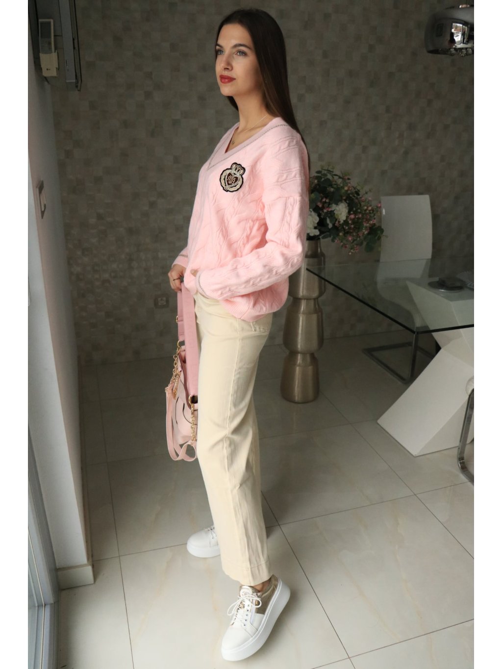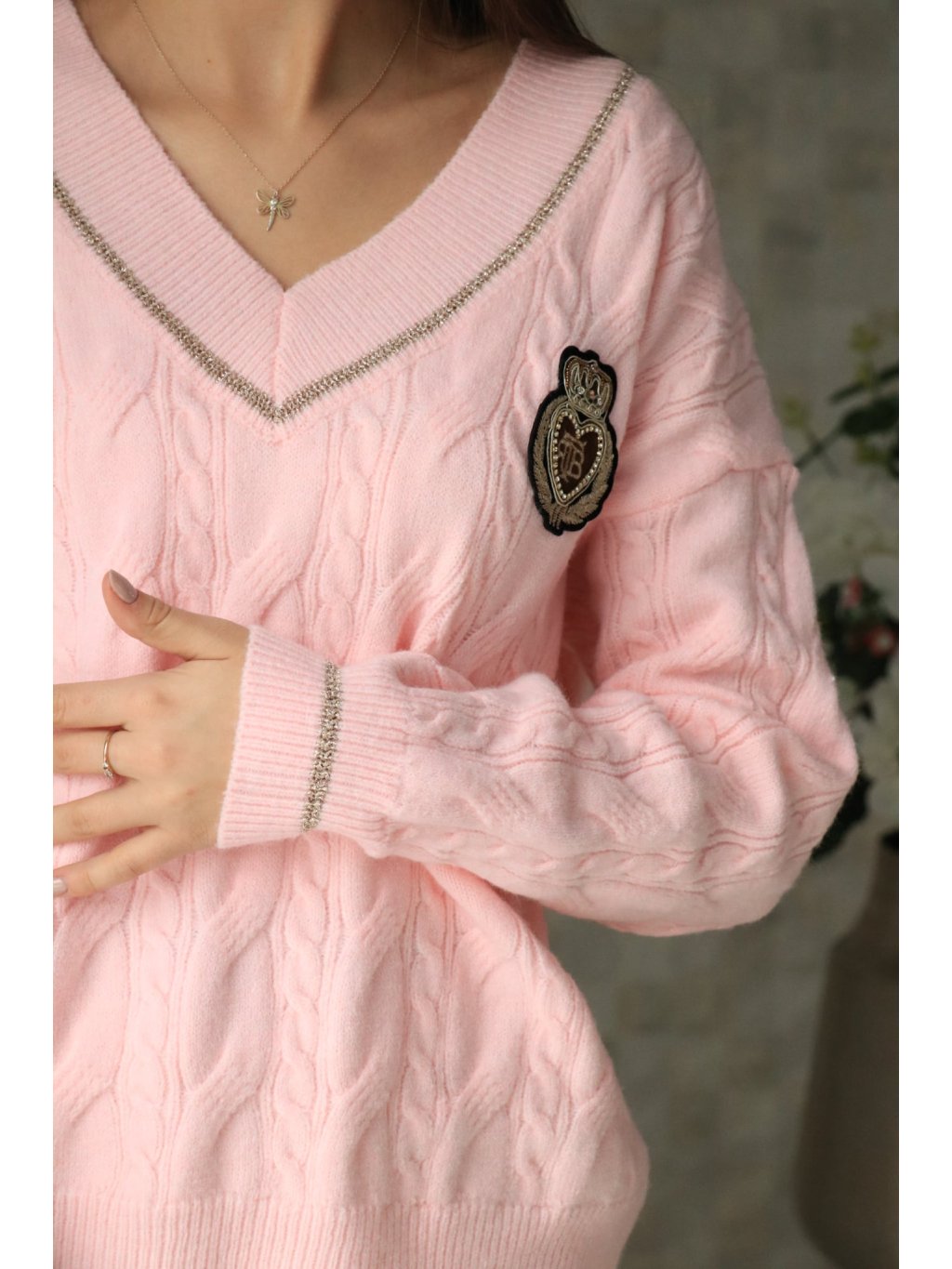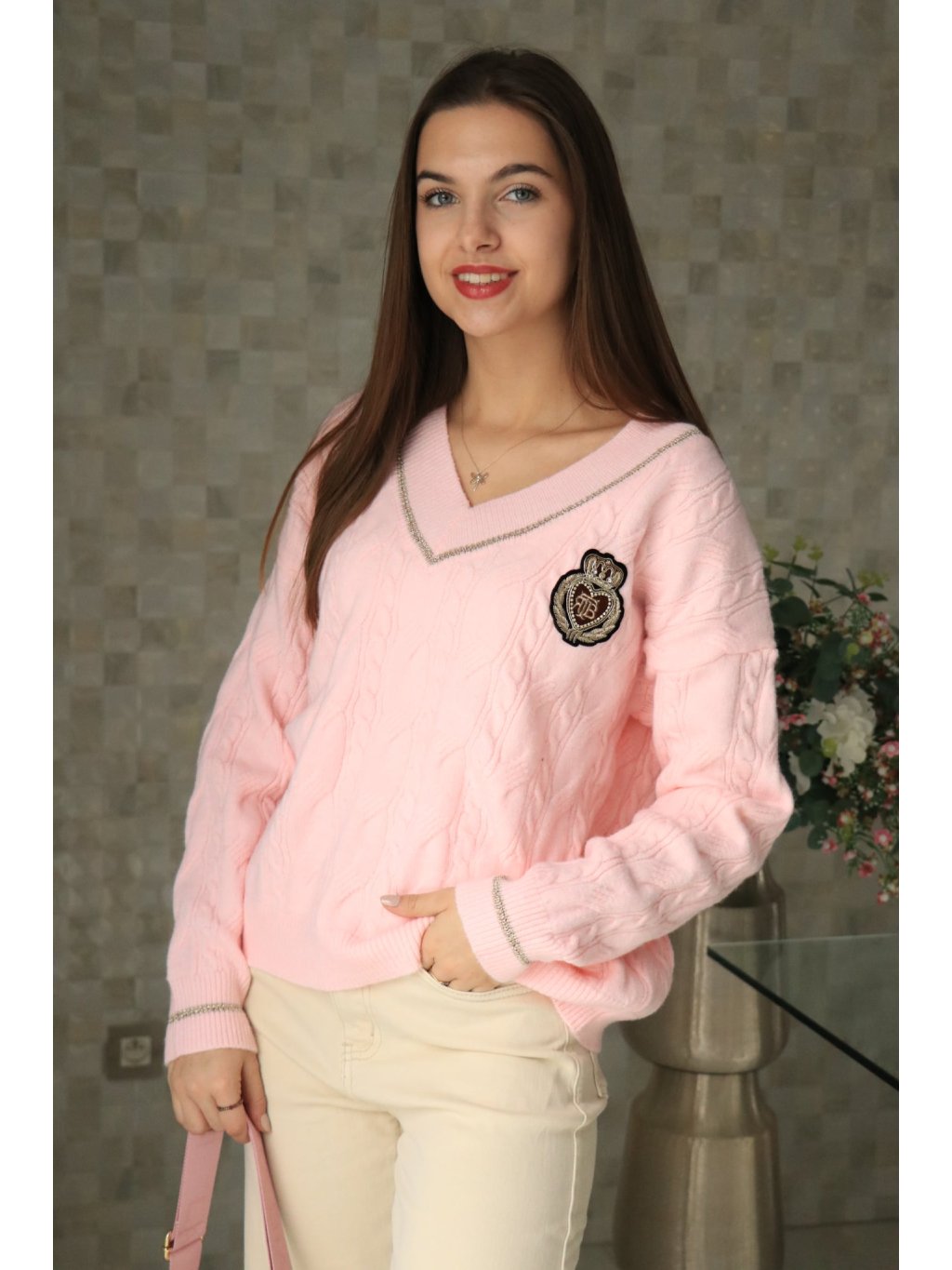 💗 Růžový svetr do V se znakem – jarní kolekce 💗
