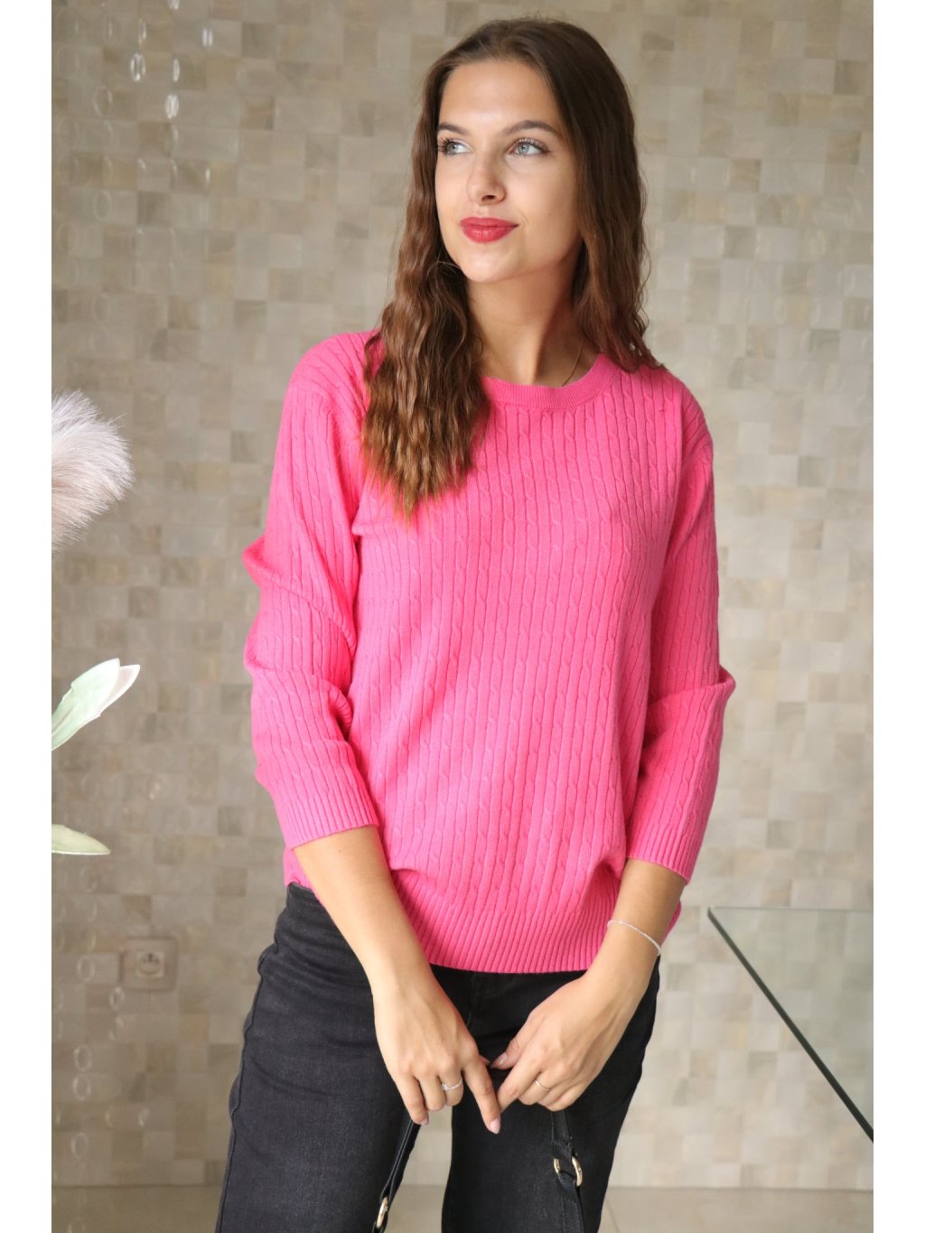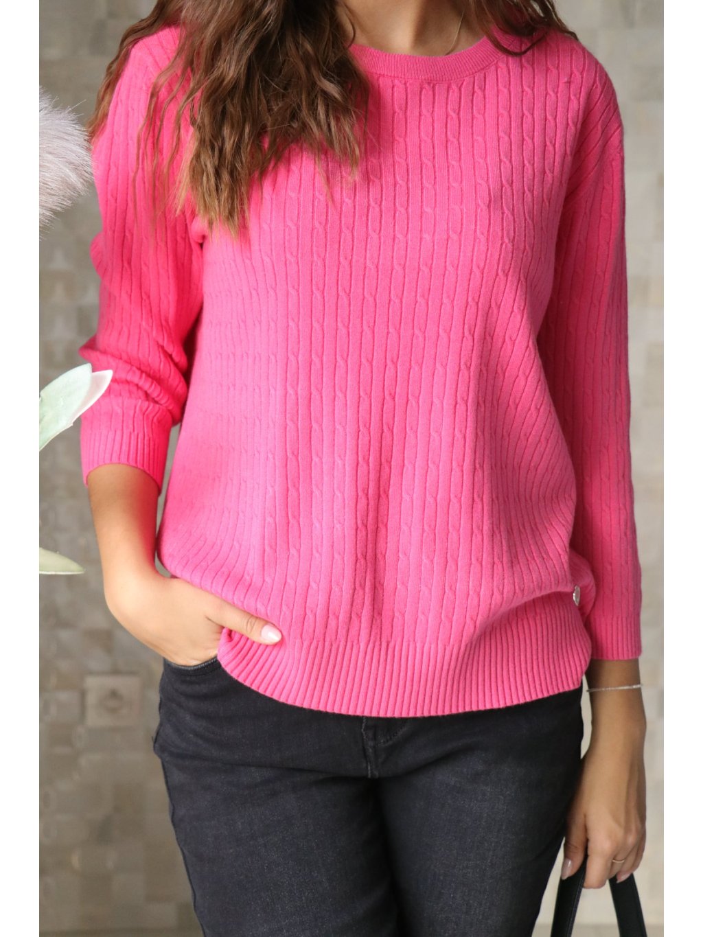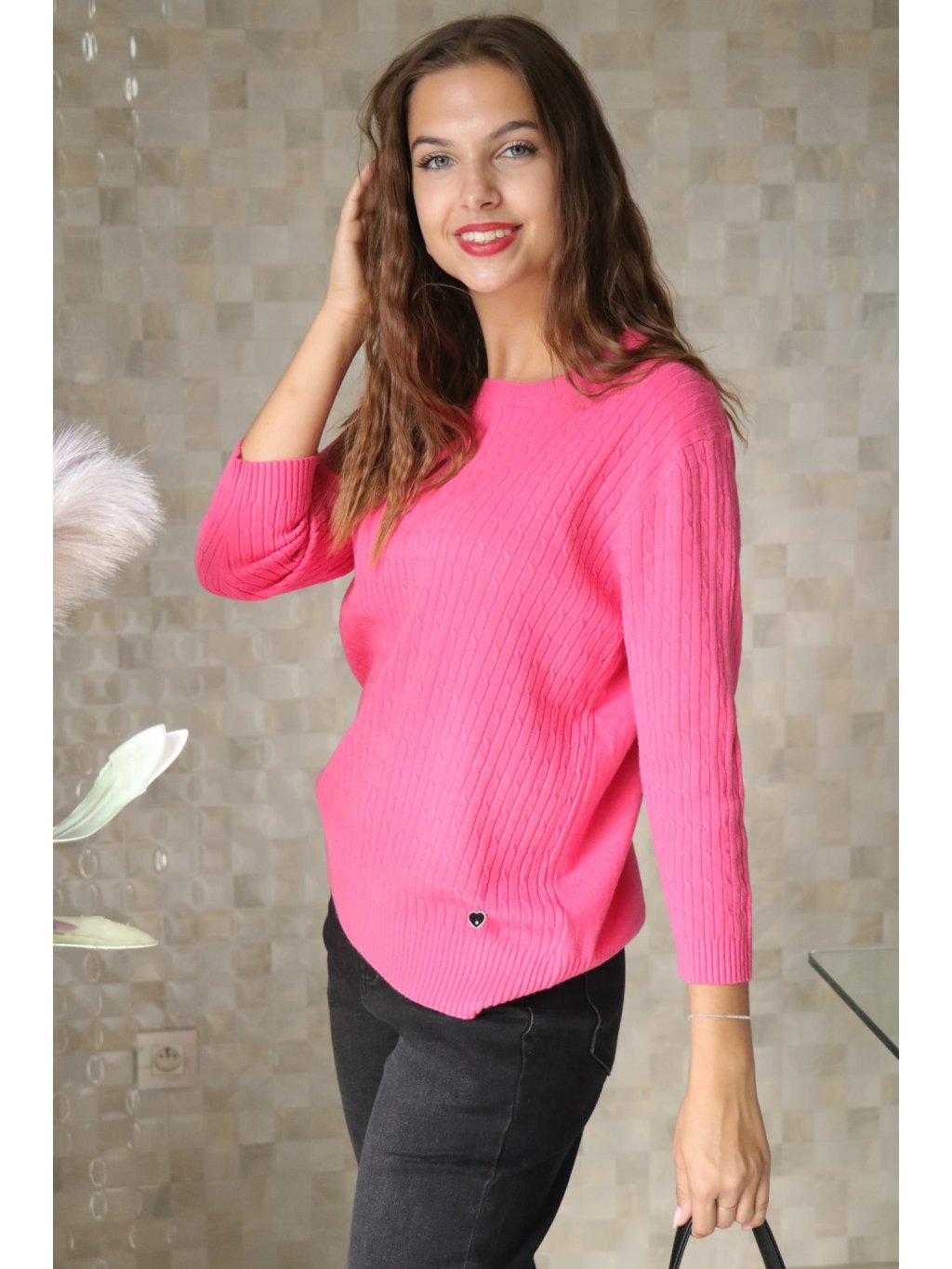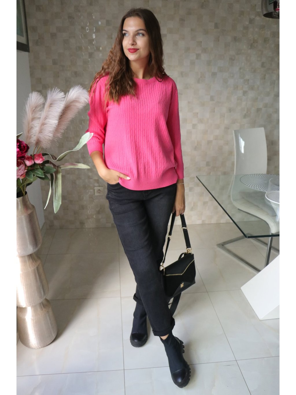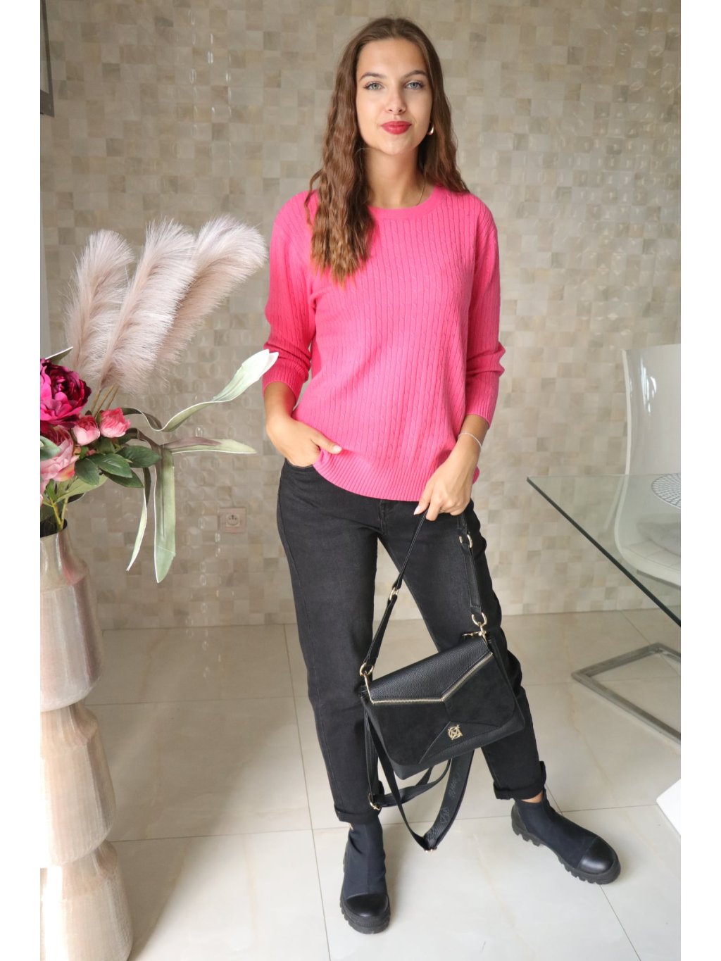 Lehký a nadýchaný svetr v elegantní růžové barvě s celoplošným jemným pleteným vzorem. Kombinace modalu a viskózy dává kousku hebkost a jemný lesk, angora přidává teplo a luxusní dotek, elastan zajišťuje pohodlnou pružnost a tvarovou stálost.
