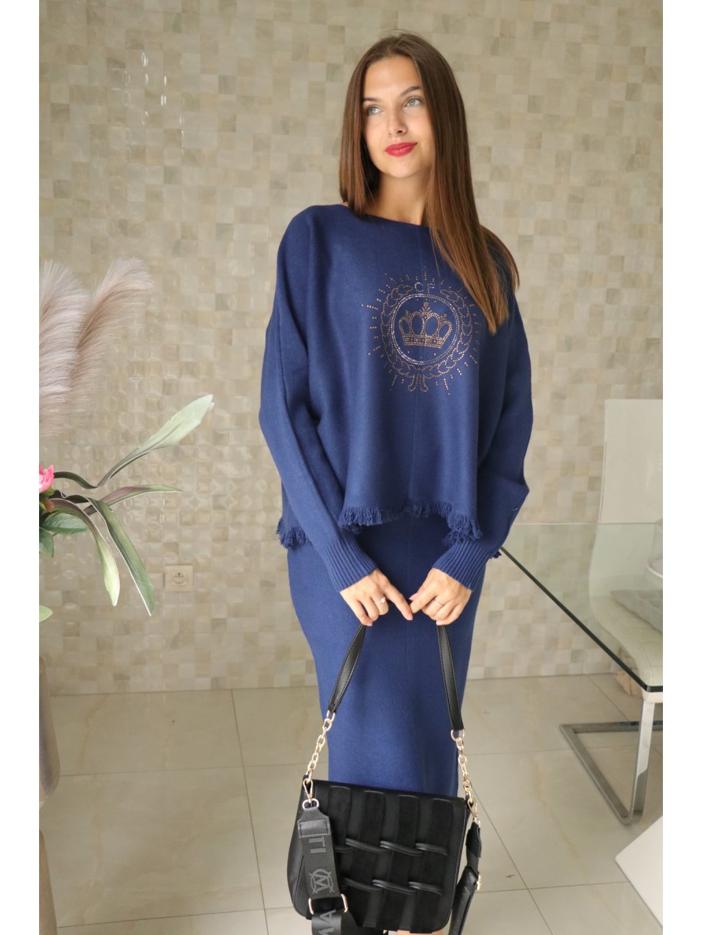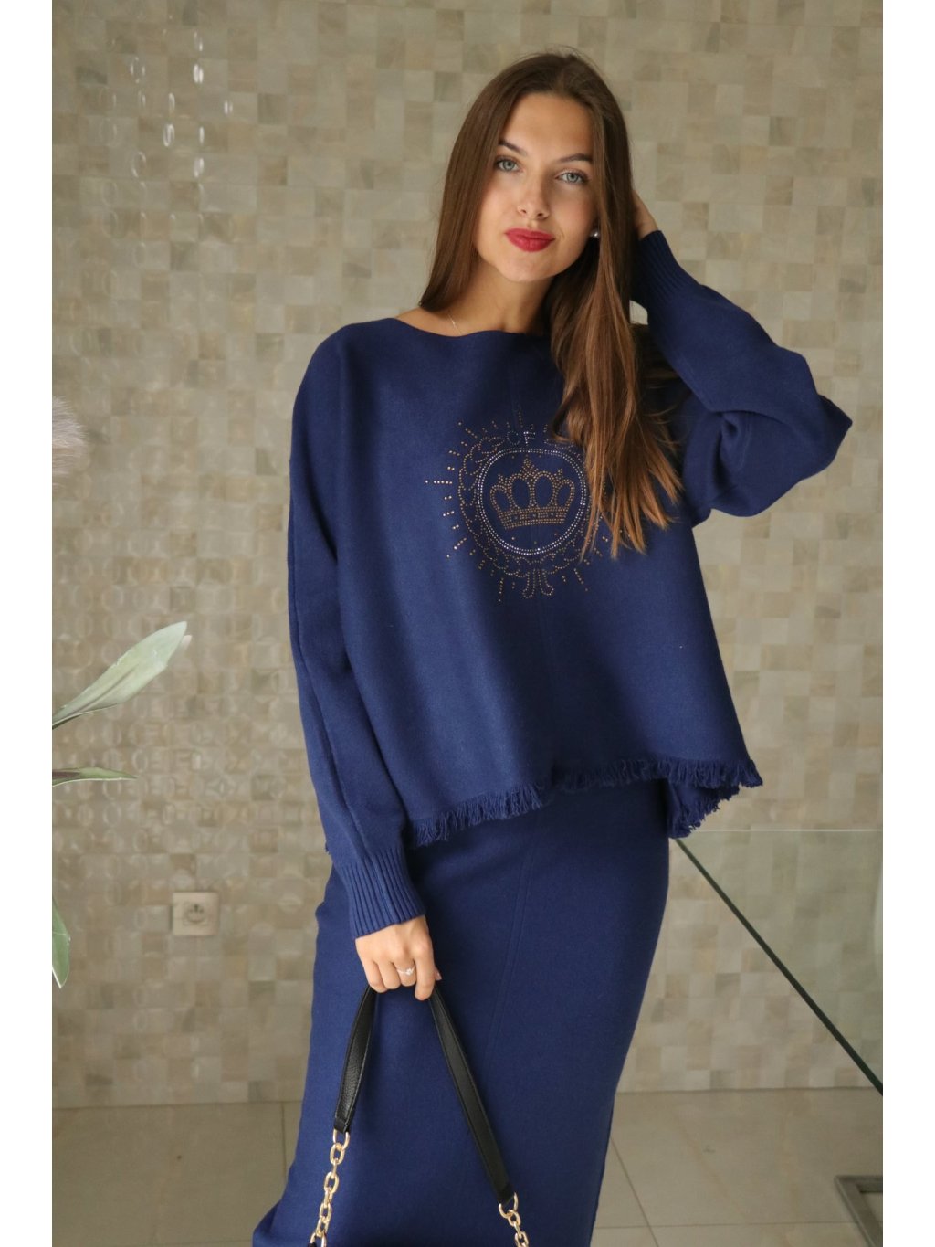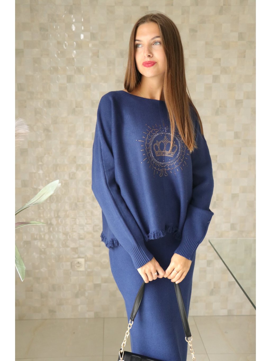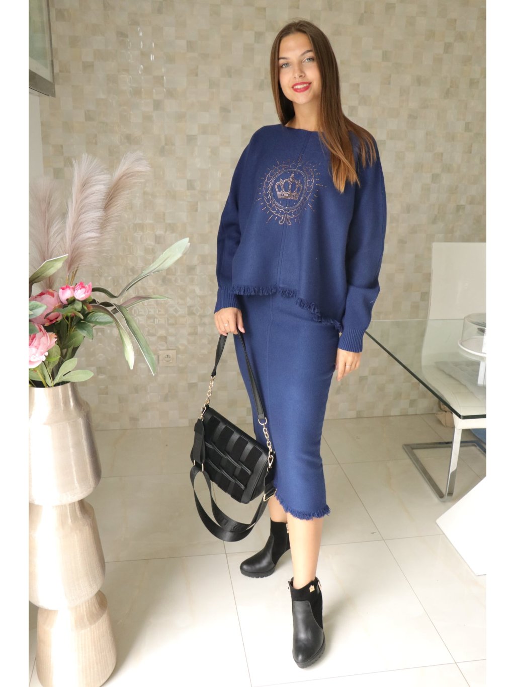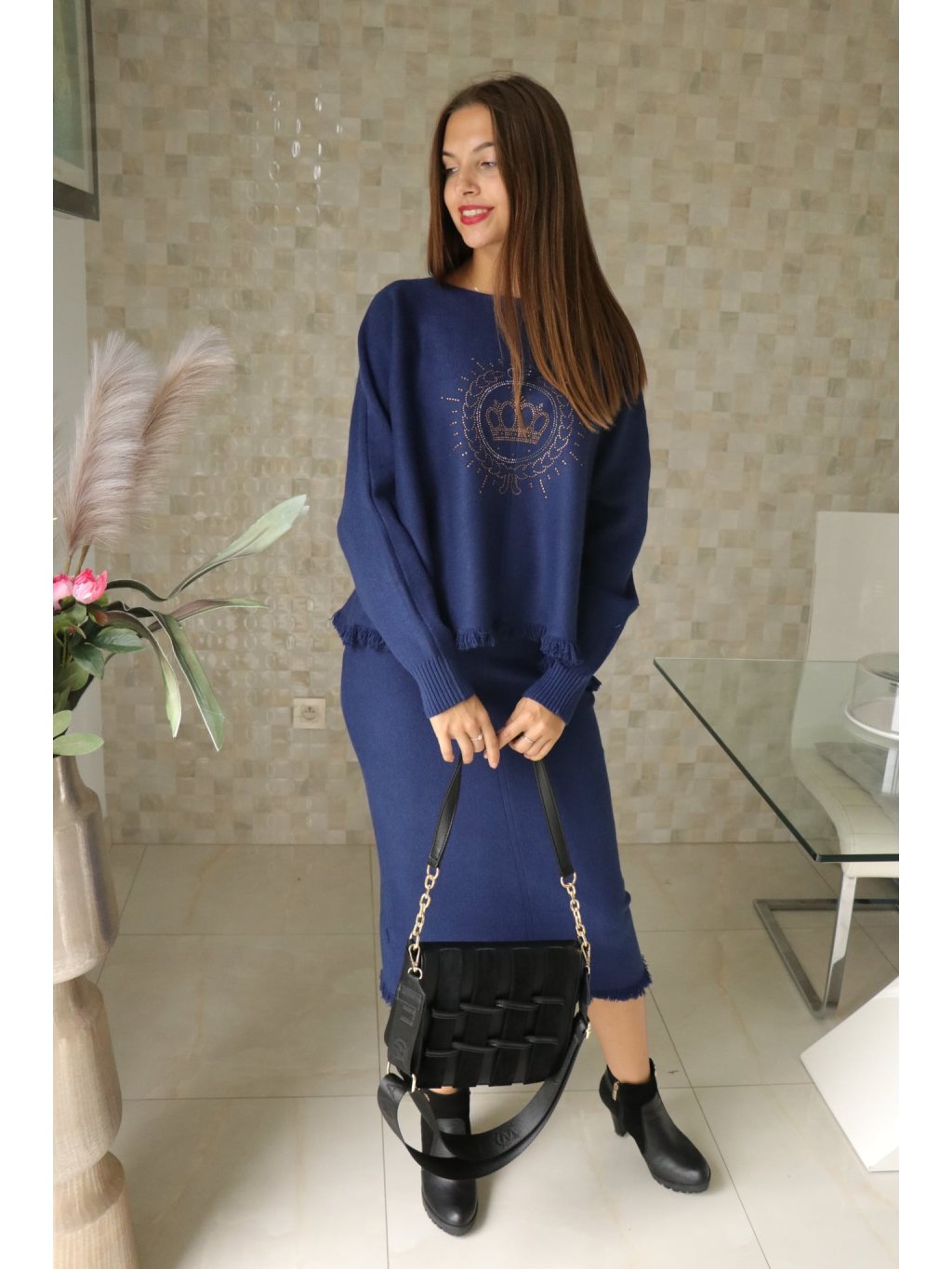 Hebká souprava (svetr + sukně) s drobnými kamínky — luxusní pocit díky angoře a jemnému lesku viskózy, přidaná dávka pružnosti pro pohodlí.