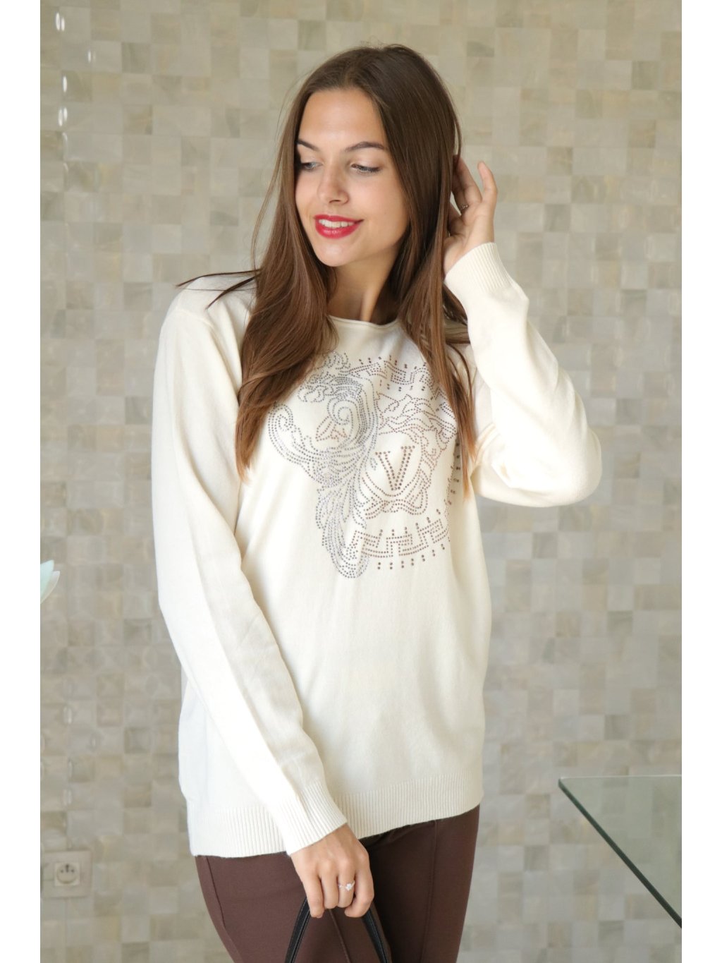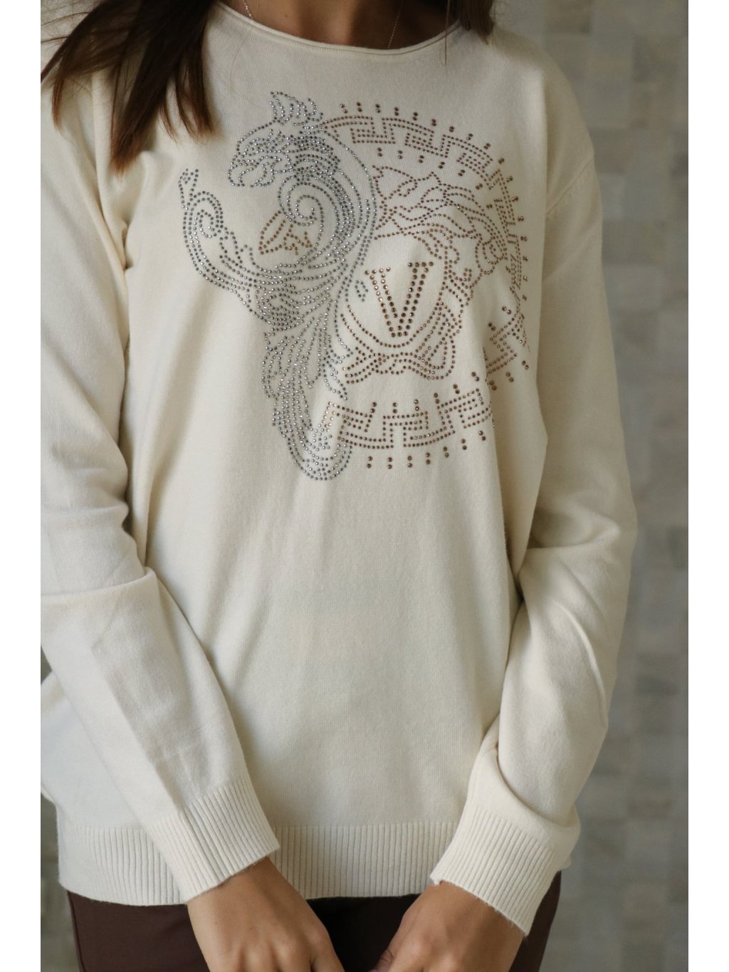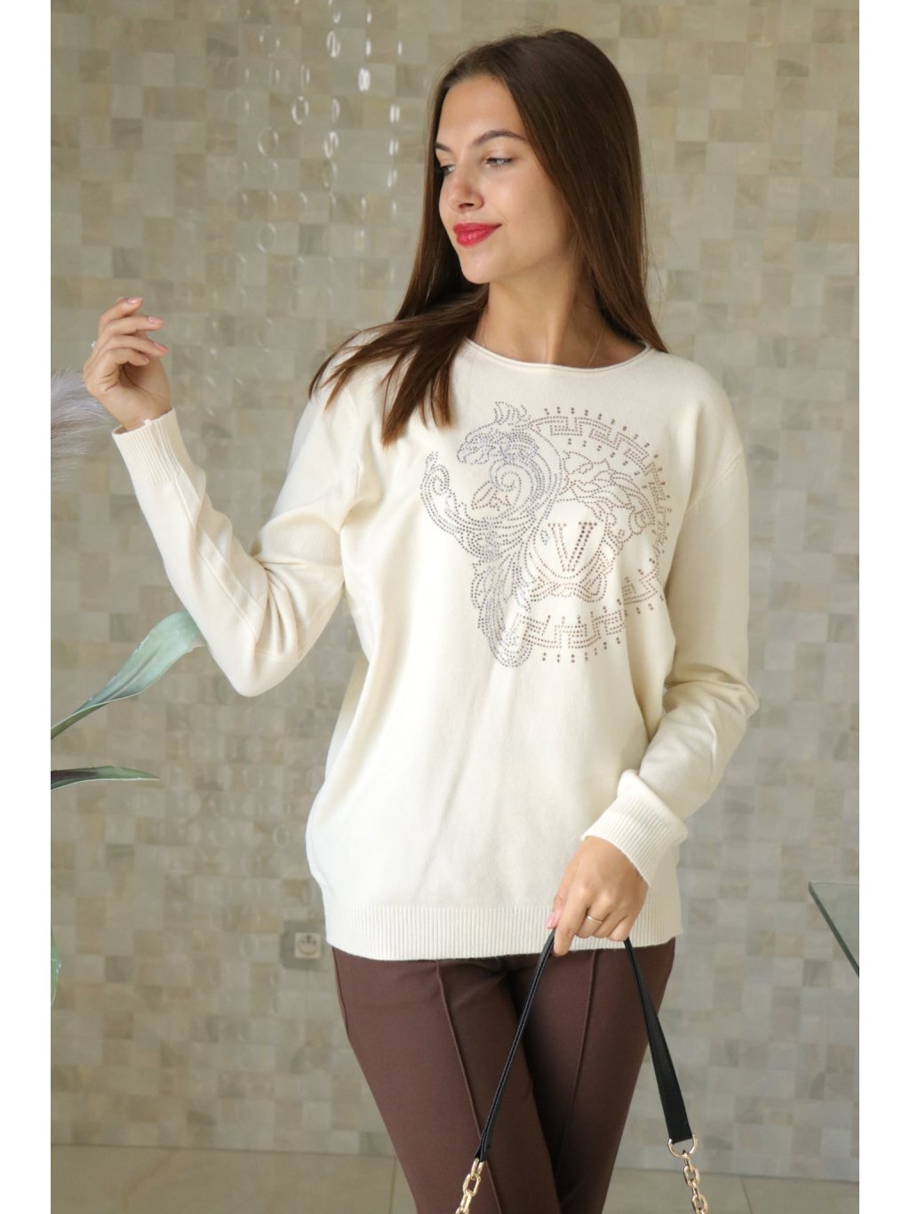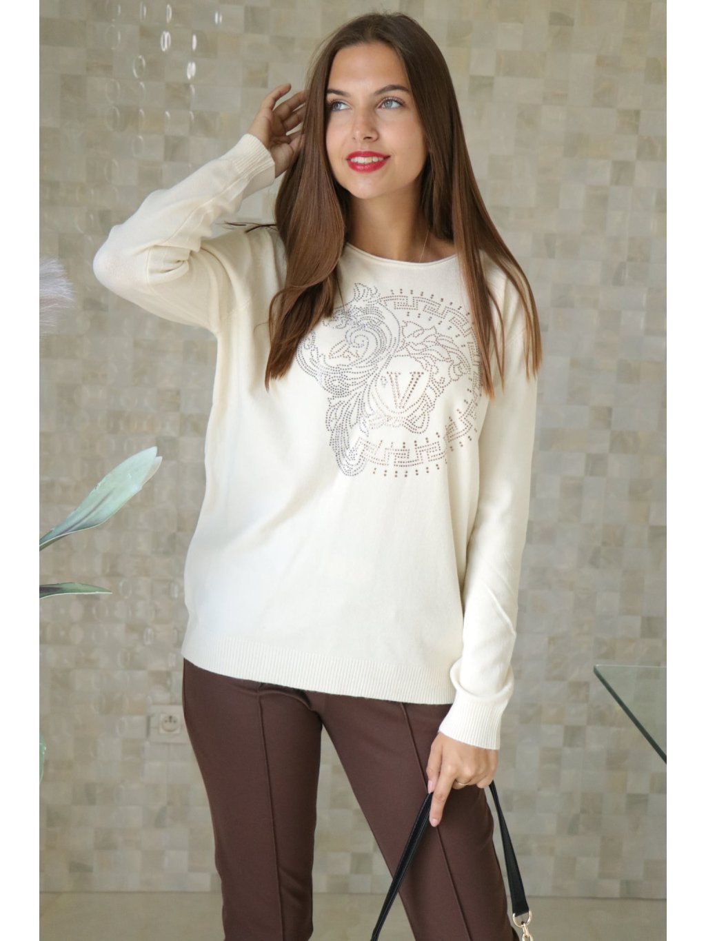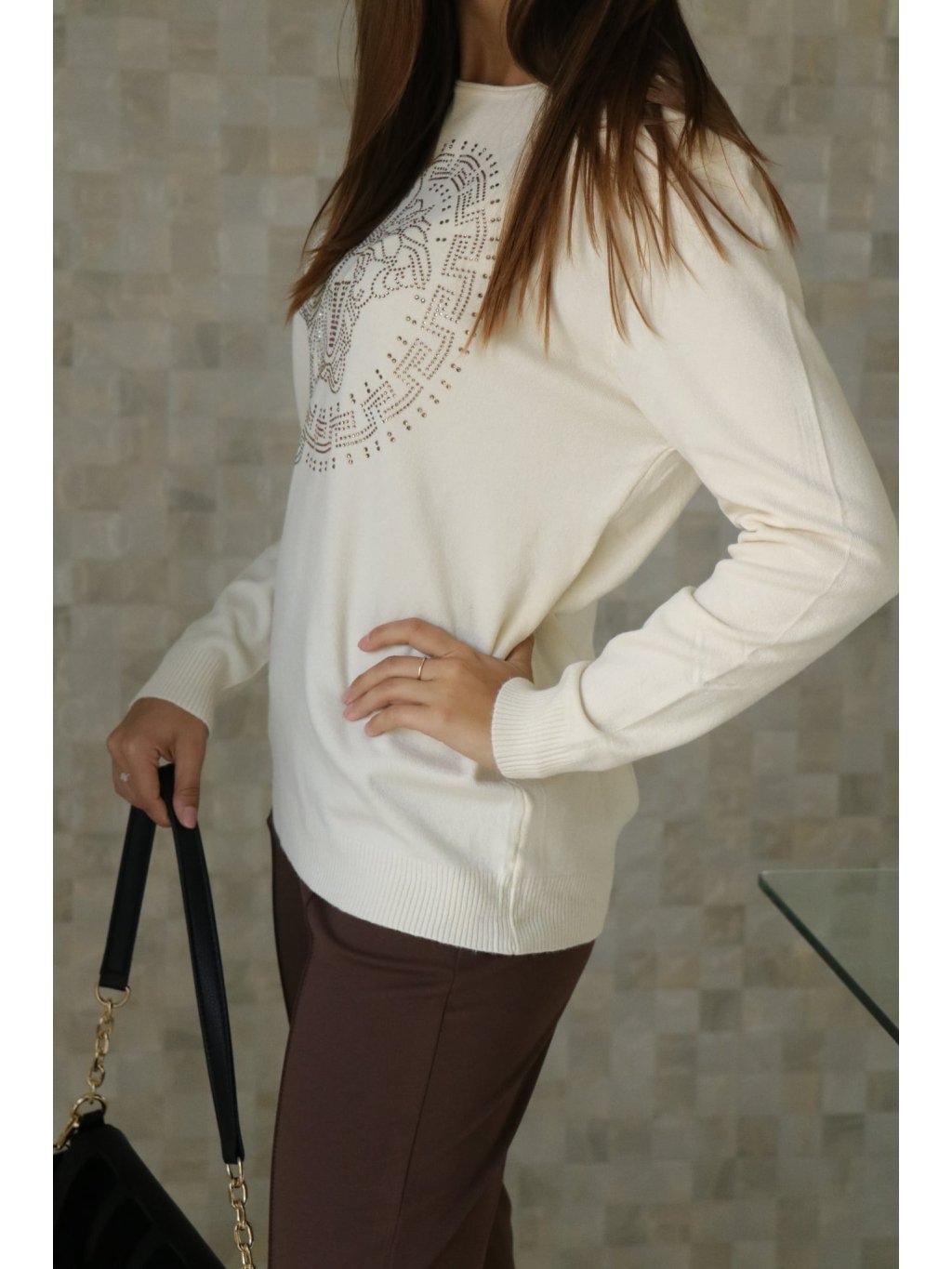 Elegantní svetr s diskrétními kamínkovými aplikacemi, příjemný na dotek a mírně pružný — ideální do práce i na večer.