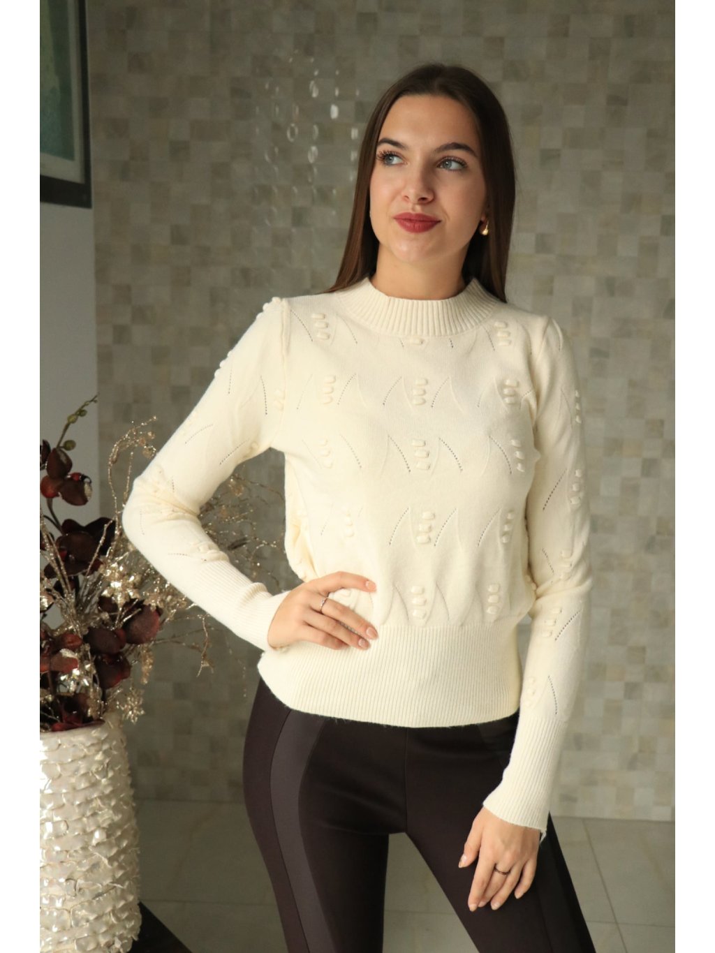 Objevte jemnou eleganci s naším okouzlujícím světle béžovým svetříkem zdobeným roztomilými vystouplými cuplíky. Tento jedinečný kousek kombinuje nadčasovou barvu s hravým designem a stane se vaším oblíbeným společníkem pro každodenní nošení.