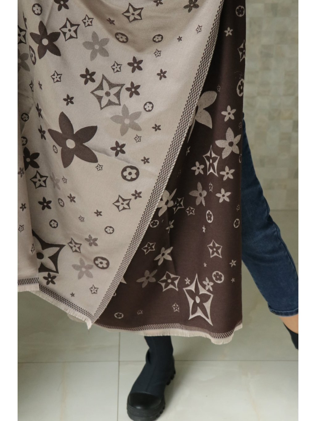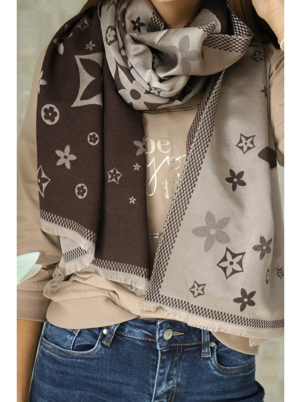Teplý šátek se znaky a květinovým motivem — čokoládový