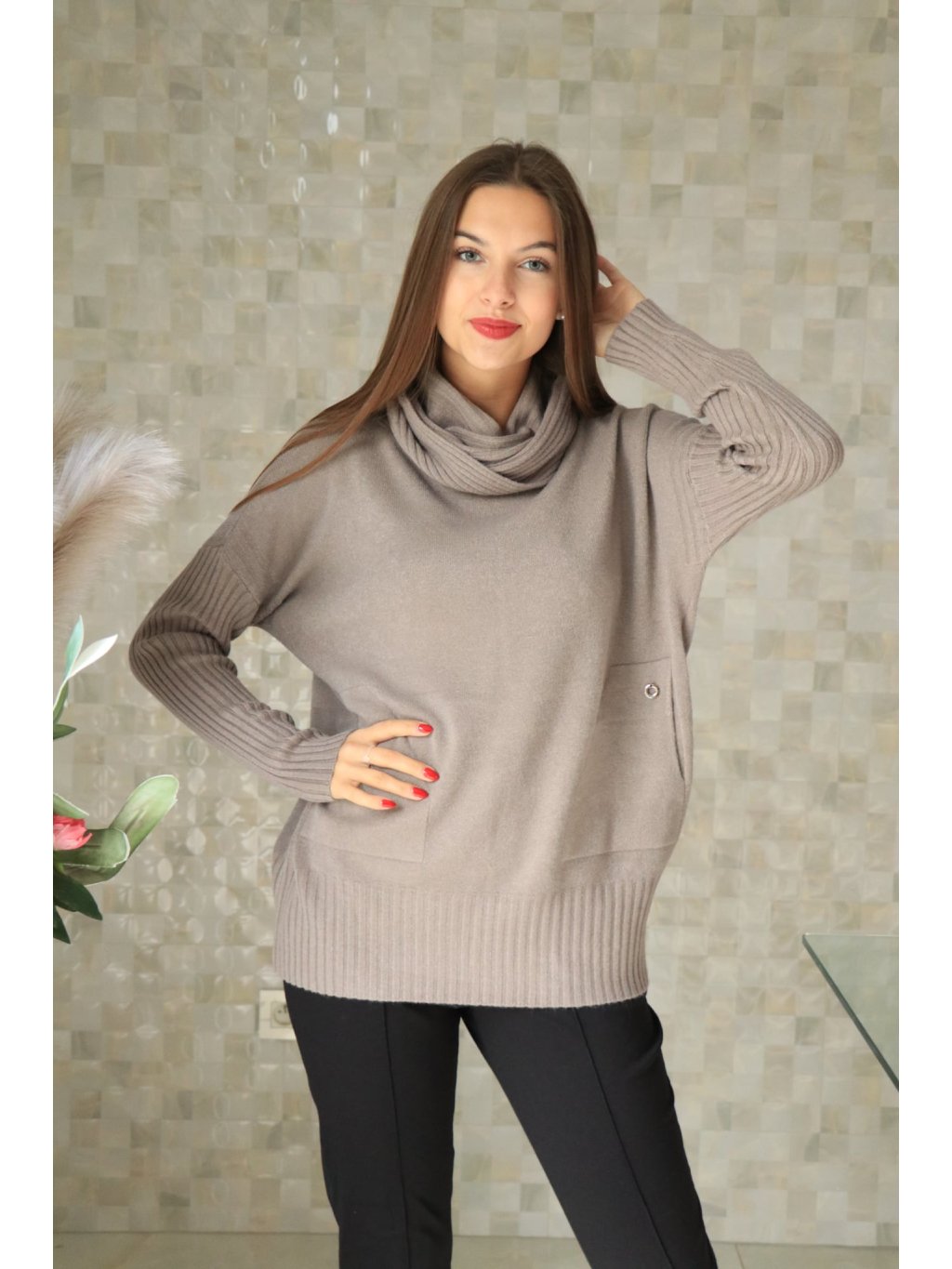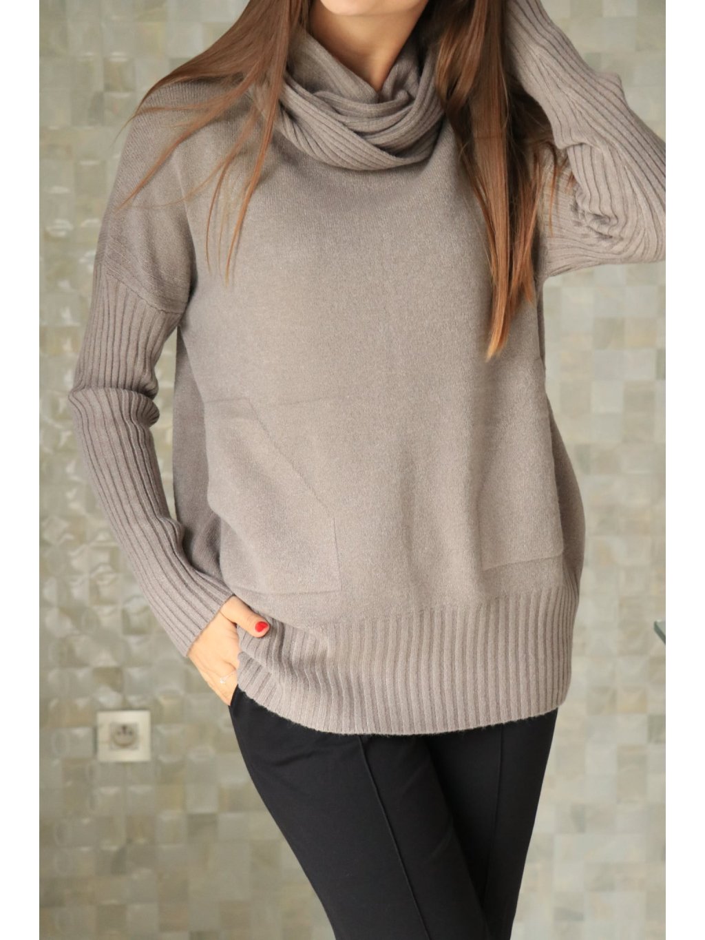 Objevte dokonalou kombinaci elegance a pohodlí s naším tmavě šedohnědým svetrem! Unikátní barevný odstín, praktický límec a funkční kapsy z něj dělají must-have kousek pro stylové podzimní a zimní outfity..