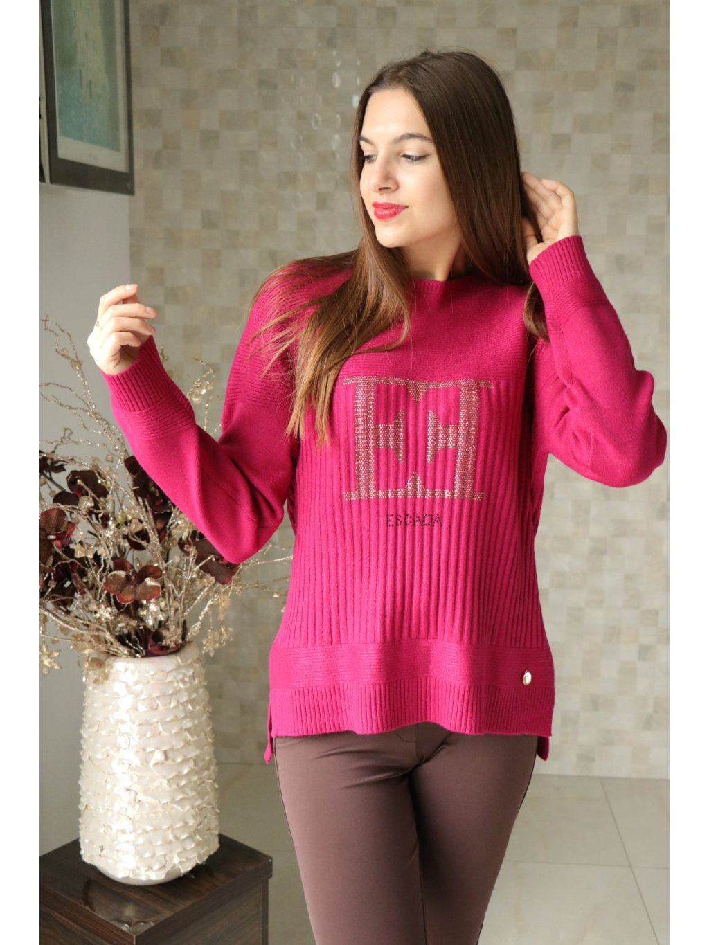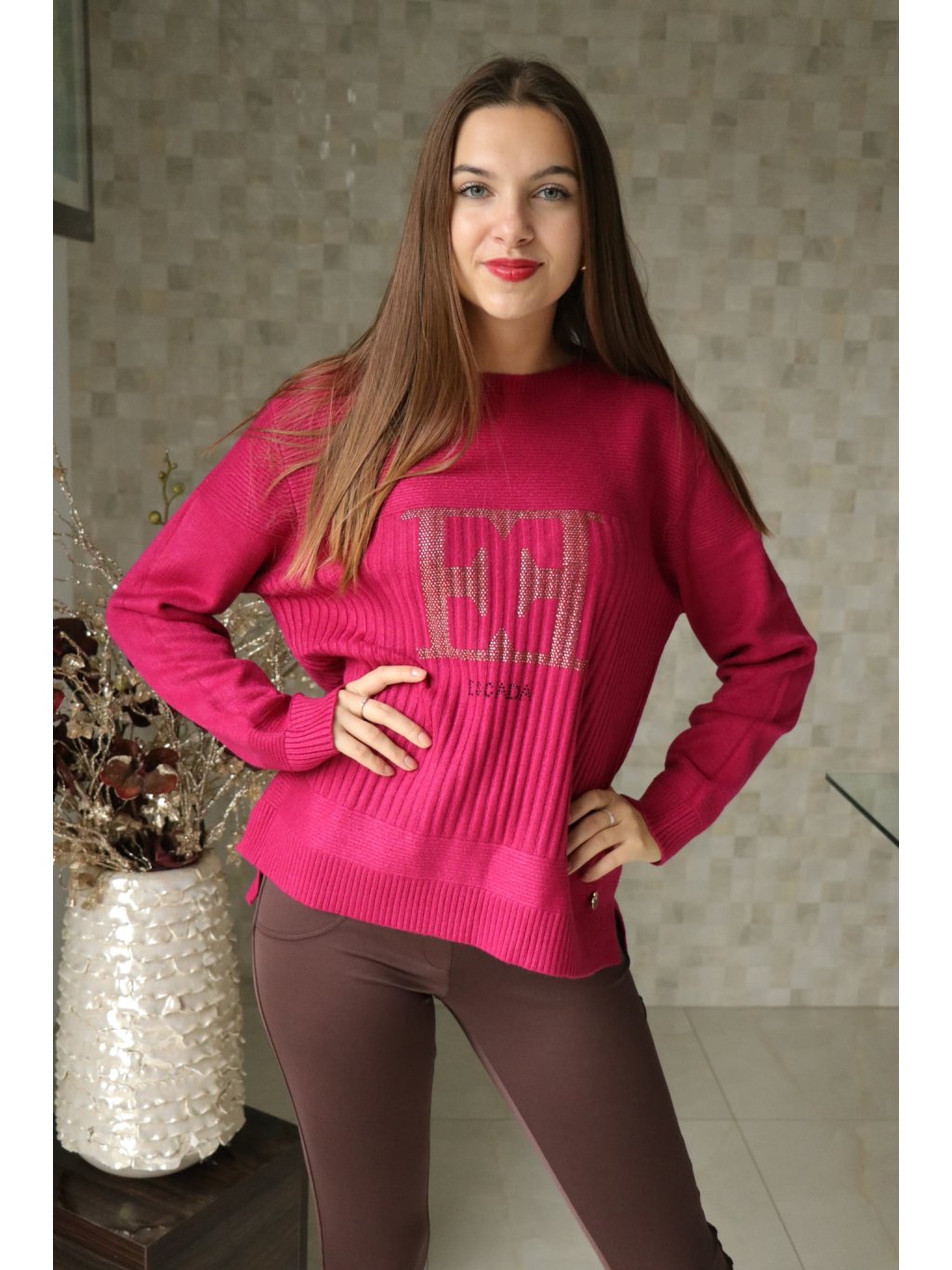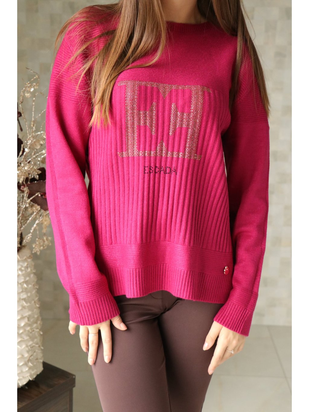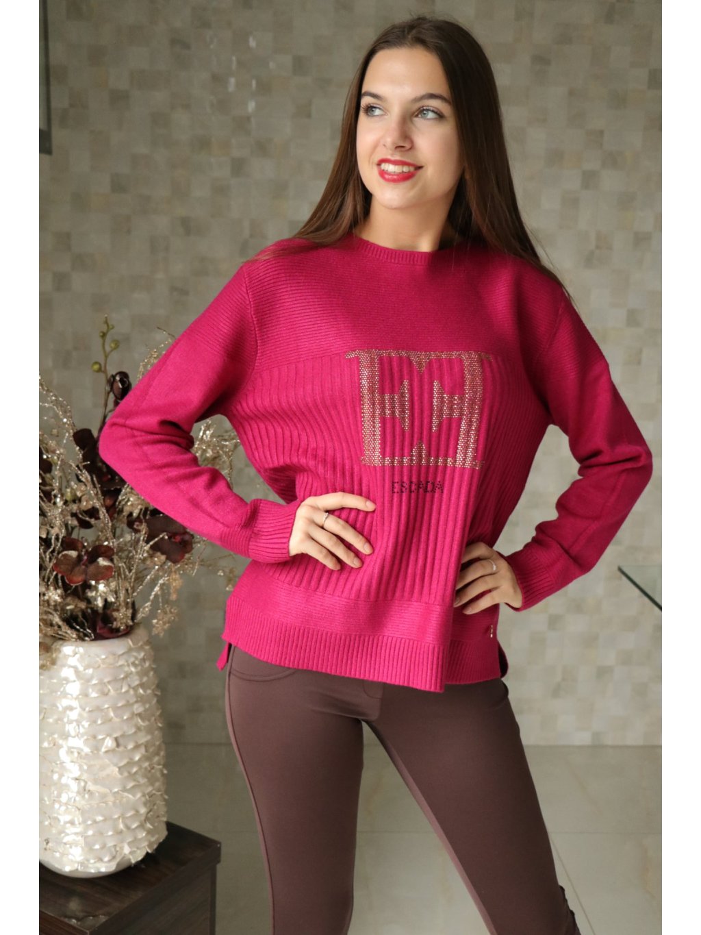 # Vínový svetr s písmeny EE ze zlatých kamínků