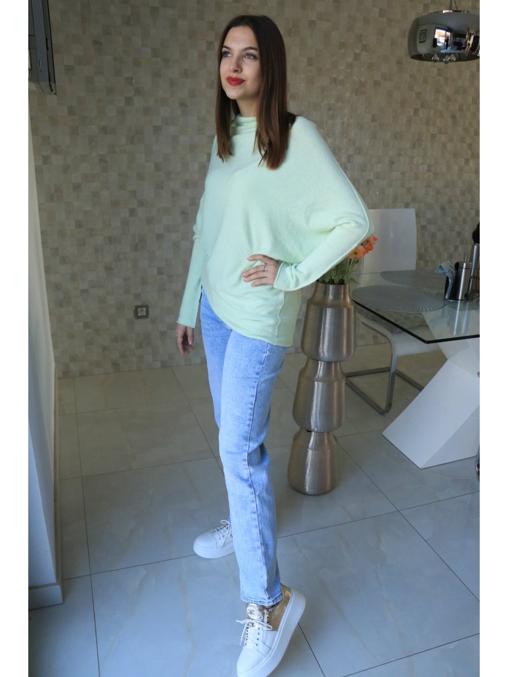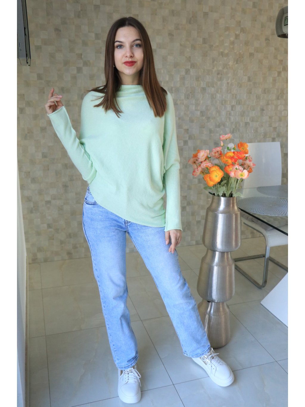 Zelenkavý jednoduchý asymetrický svetr