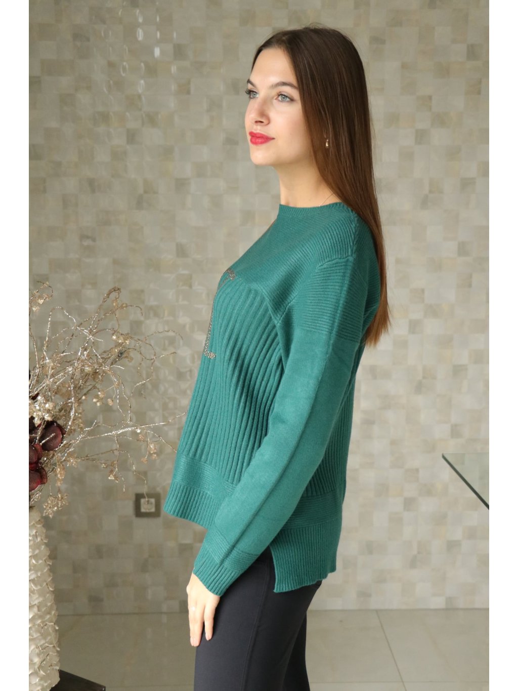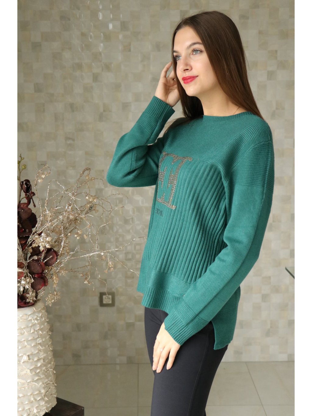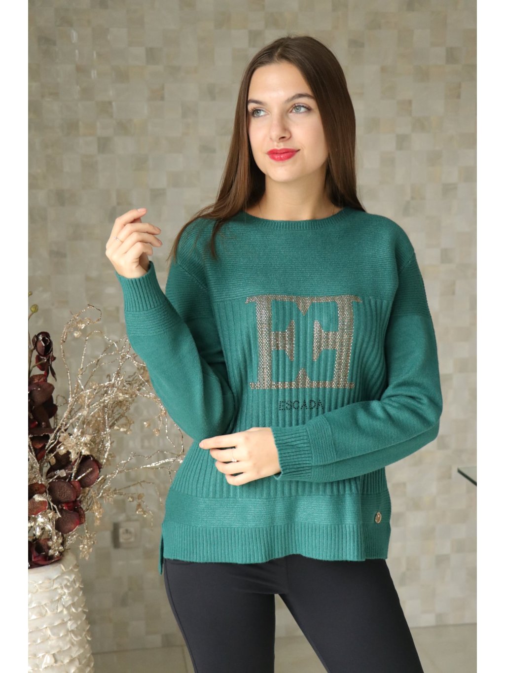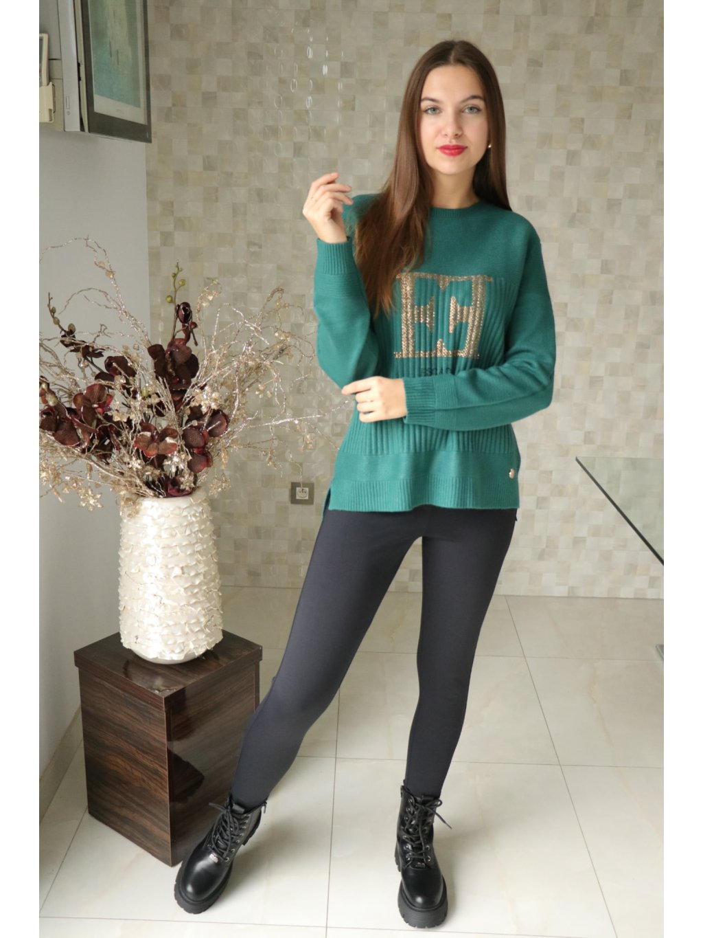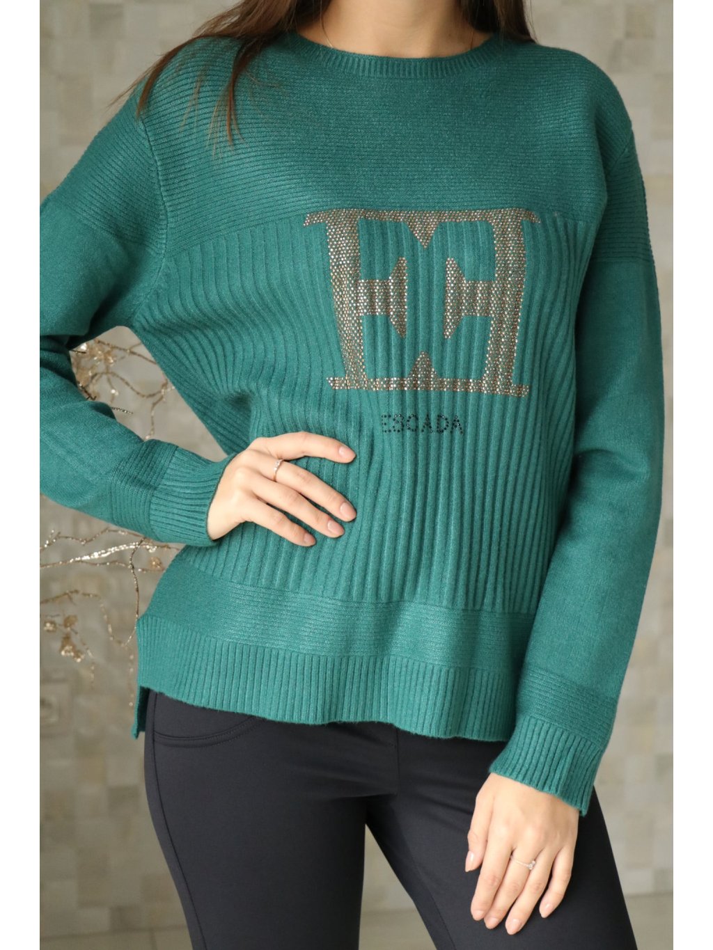 Zelený svetr s písmeny EE ze zlatých kamínků vel. UNI
