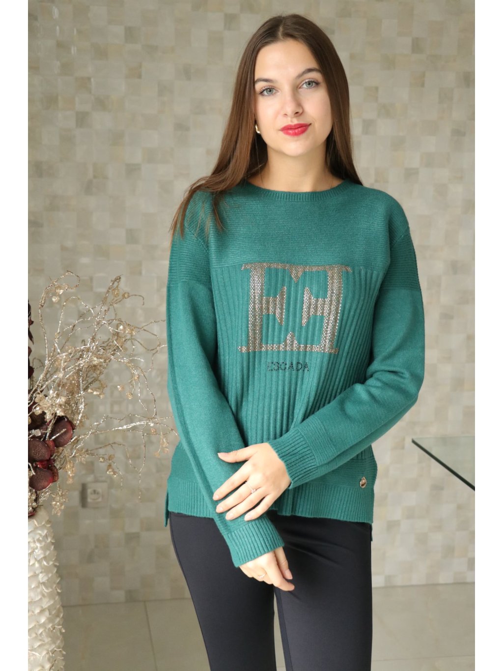 # Zelený svetr s písmeny EE ze zlatých kamínků