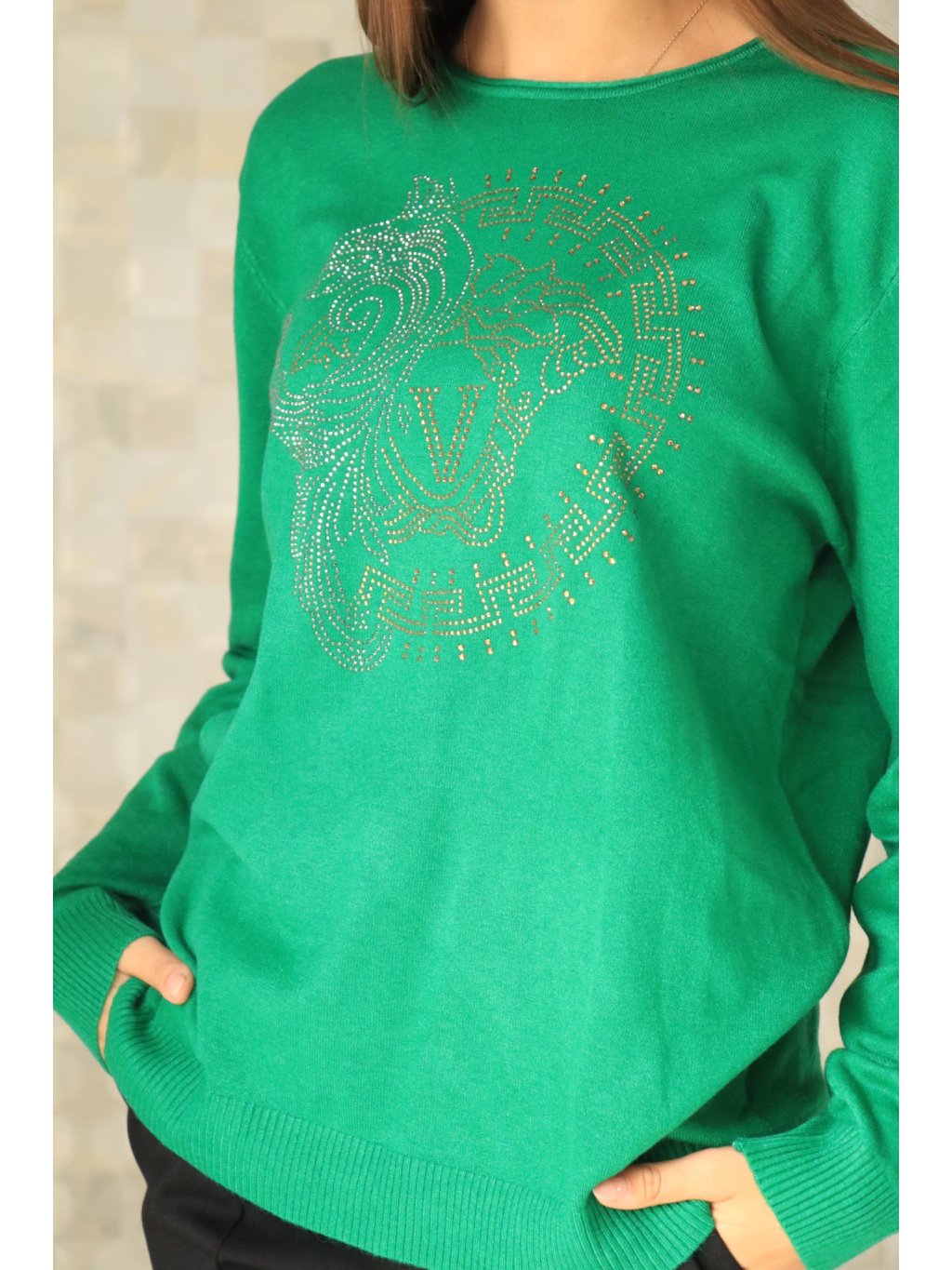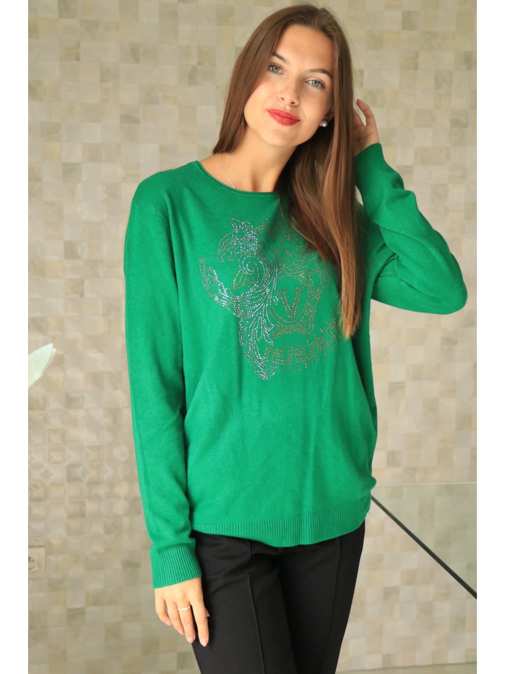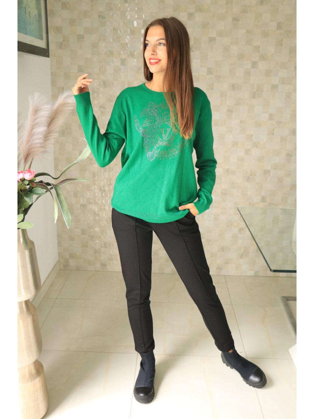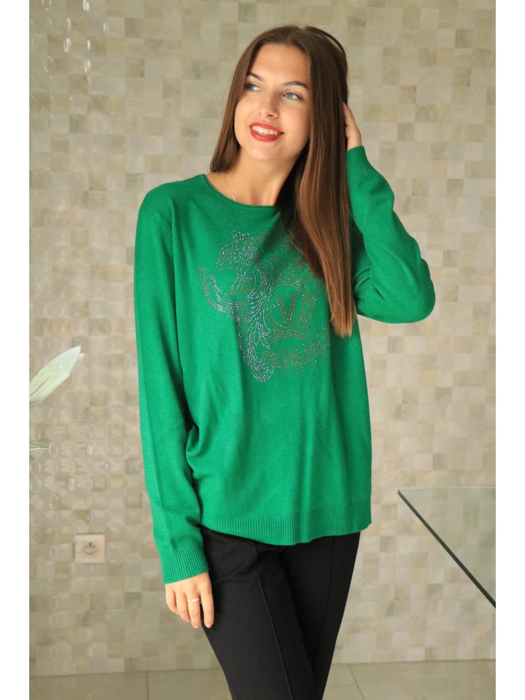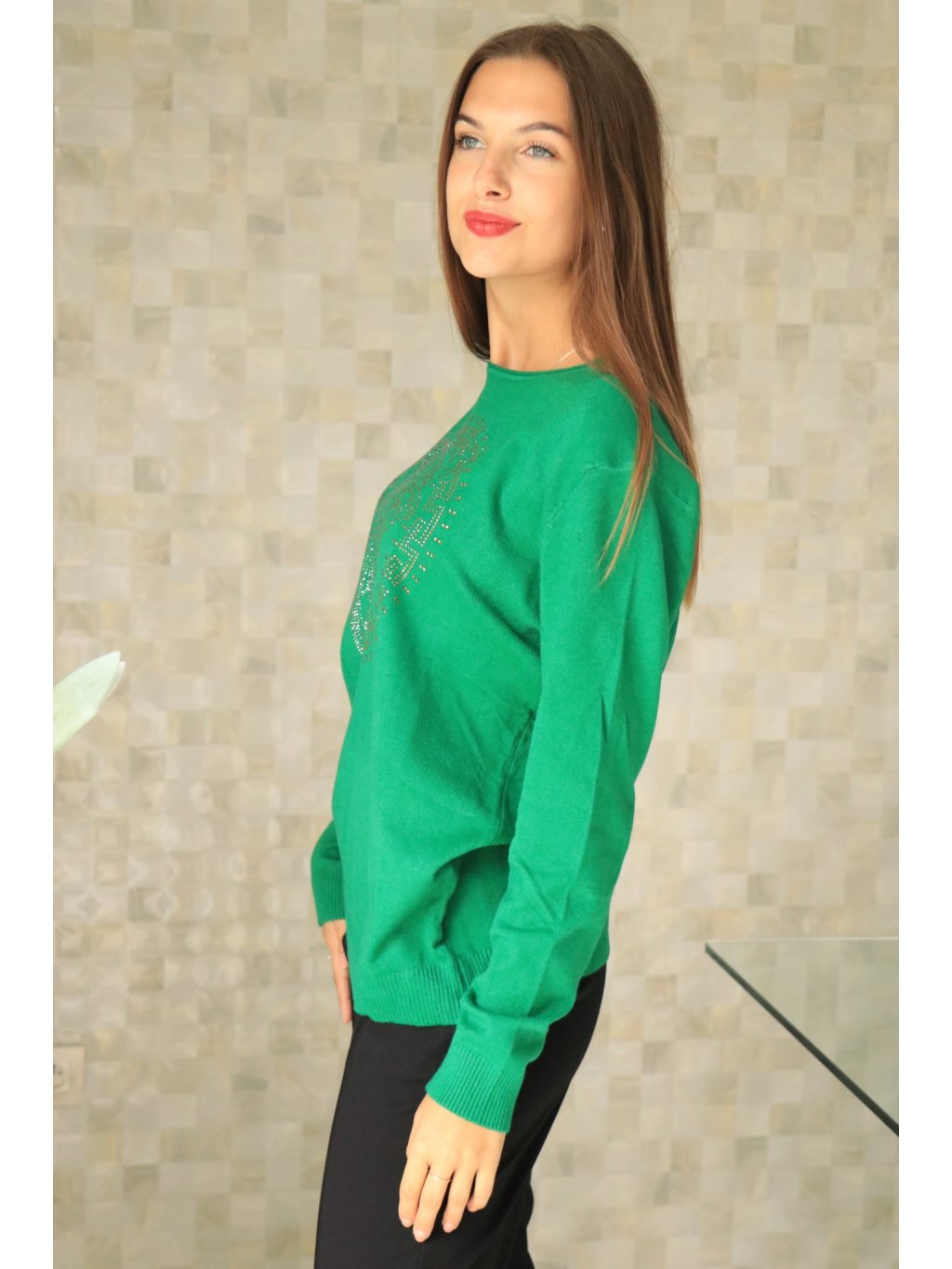 Elegantní svetr s diskrétními kamínkovými aplikacemi, příjemný na dotek a mírně pružný — ideální do práce i na večer.
