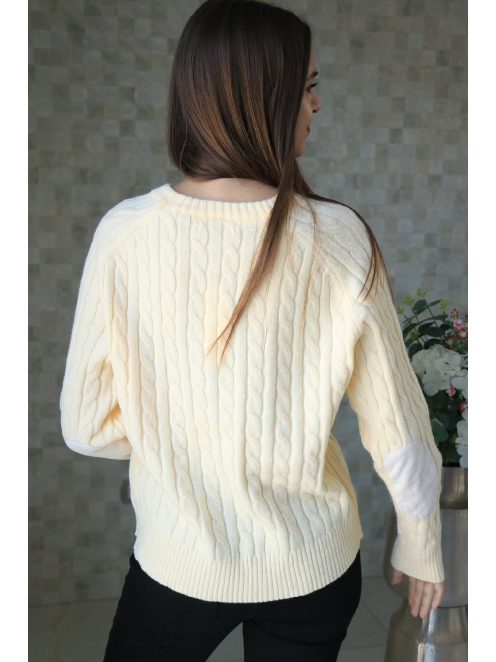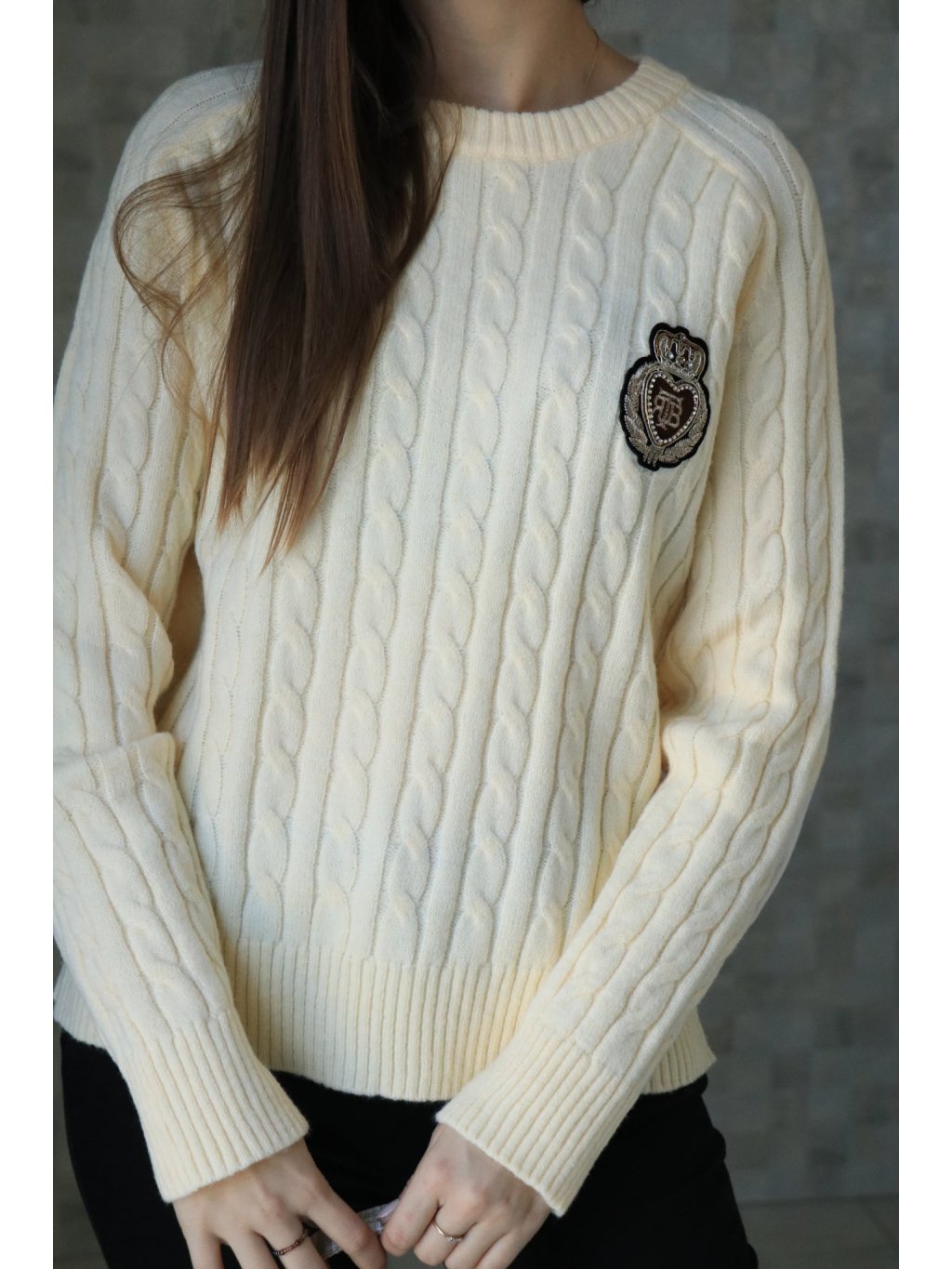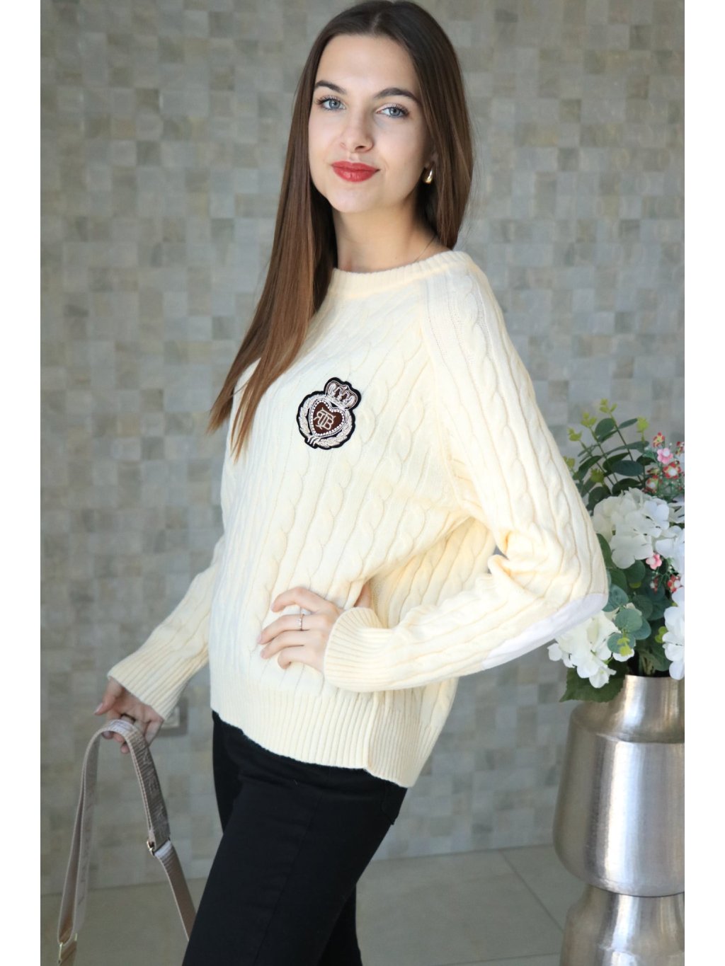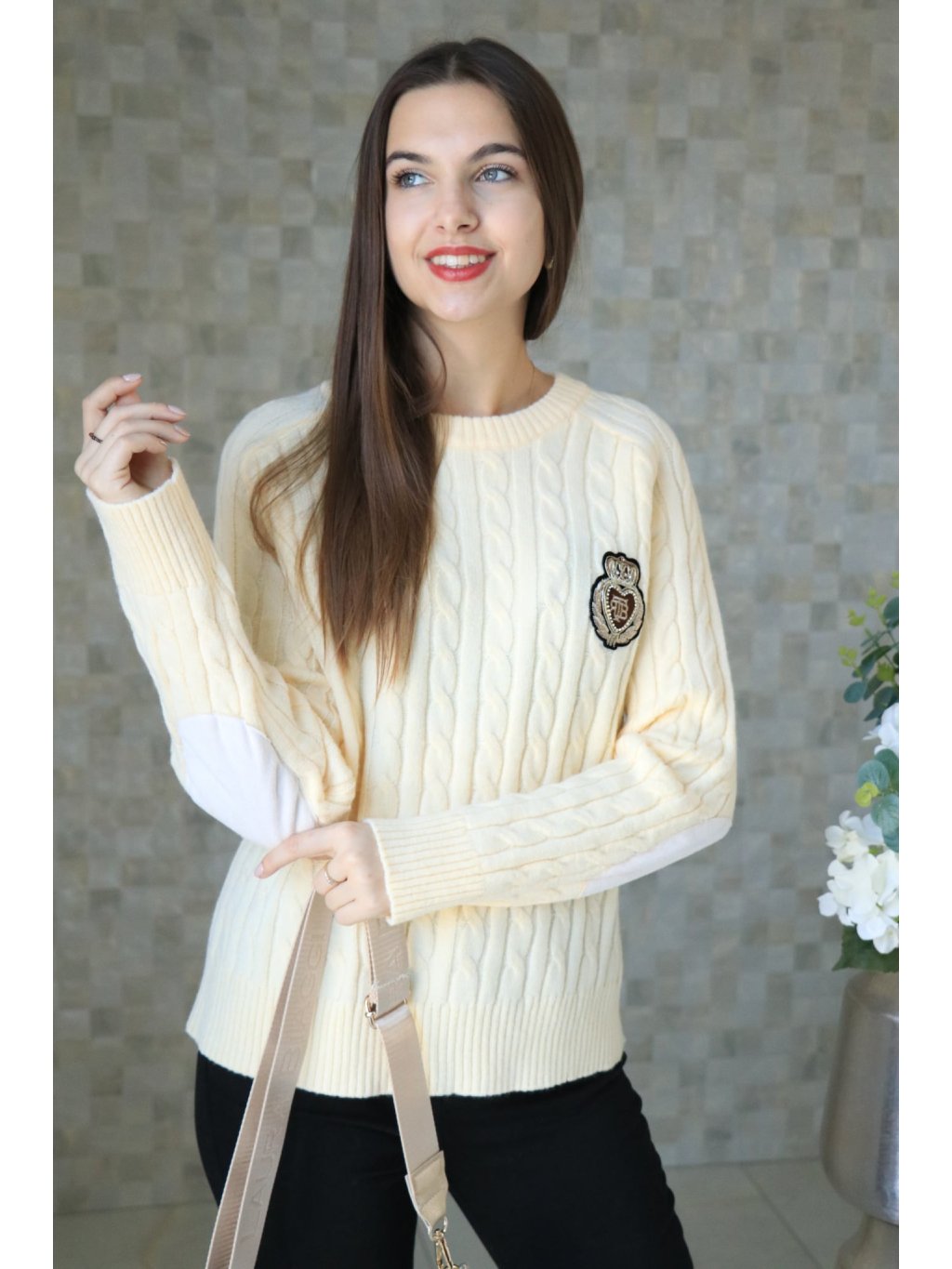 Žlutý svetr s kulatým výstřihem a hnědým znakem vel. UNI